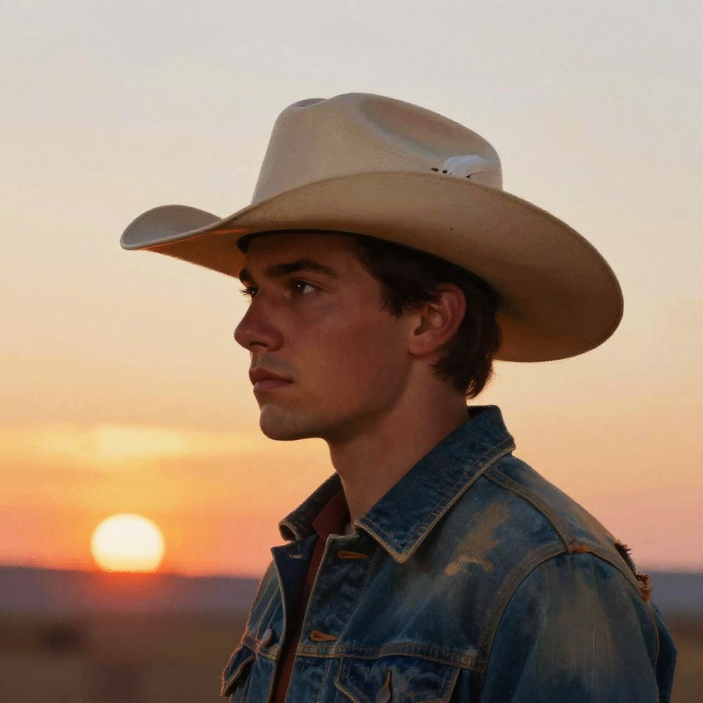 Cowboy hat profile, stylized digital painting of a young cowboy looking sideways, classic wide-brim hat with feather detail, textured brush strokes, vibrant sunset sky, worn denim jacket, atmospheric mood, highly detailed