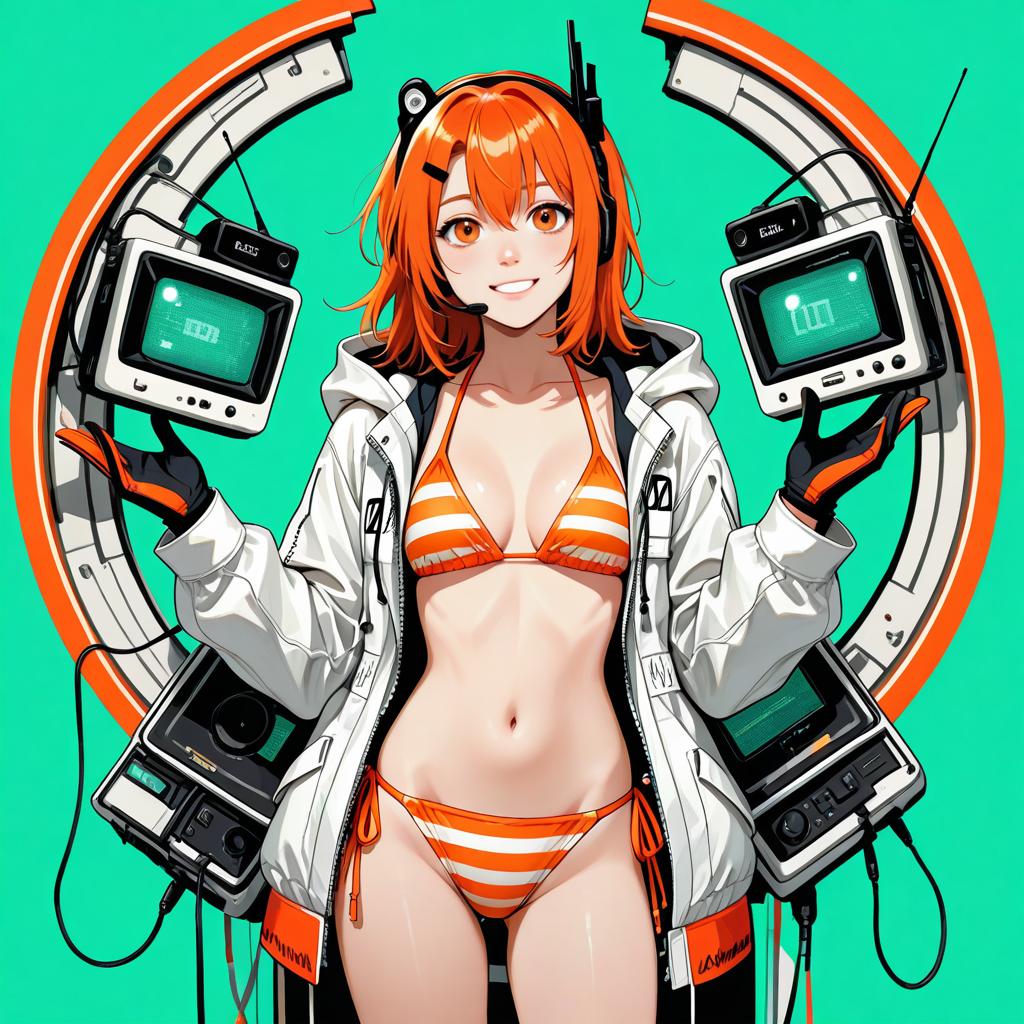 Cowboy shot, adachi rei, android, 1girl, orange hair, orange eyes, grin, striped bikini, orange bikini, side-tie bikini bottom, white jacket, open jacket, long sleeves, hooded jacket, hair ornament, hairclip, ribbon, two-tone gloves, black gloves, headset, radio antenna, looking at viewer, vibrant green background, raised hands, deep-shadow-dramatic, portable computer