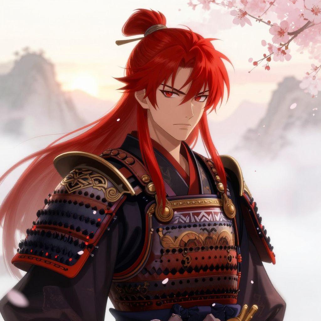 Anime boy with long blonde hair dressed in traditional samurai clothing, cherry blossoms falling, intense gaze, detailed armor textures, cinematic lighting