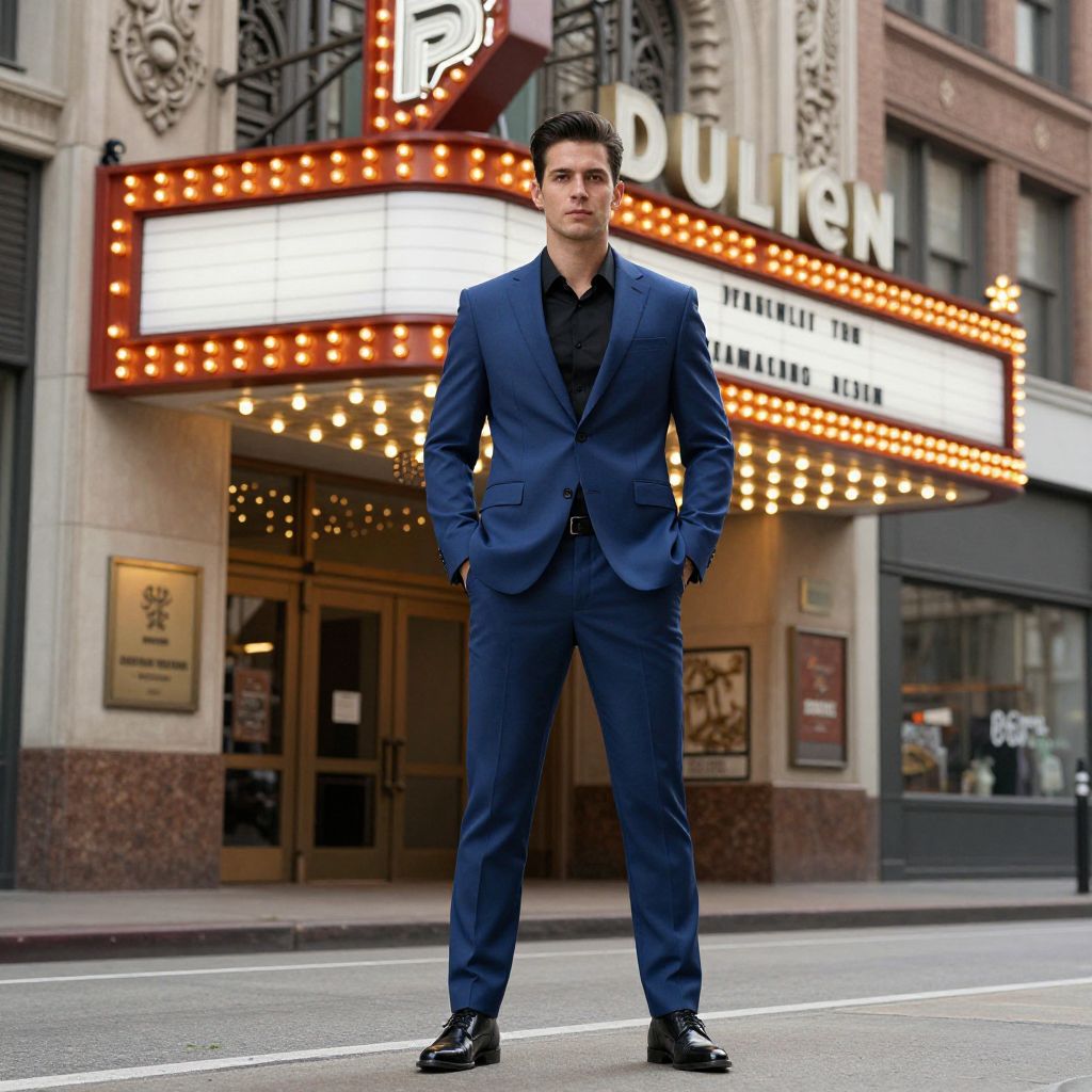 A photograph of a handsome man standing on a city street in front of a vintage movie theater marquee. He's wearing a sharp blue suit, black shirt, and shiny black shoes, with his hands in his pockets. The marquee is lit up with bright orange bulbs and white signs. He has short, dark hair and a confident expression. The building behind him has ornate architecture.