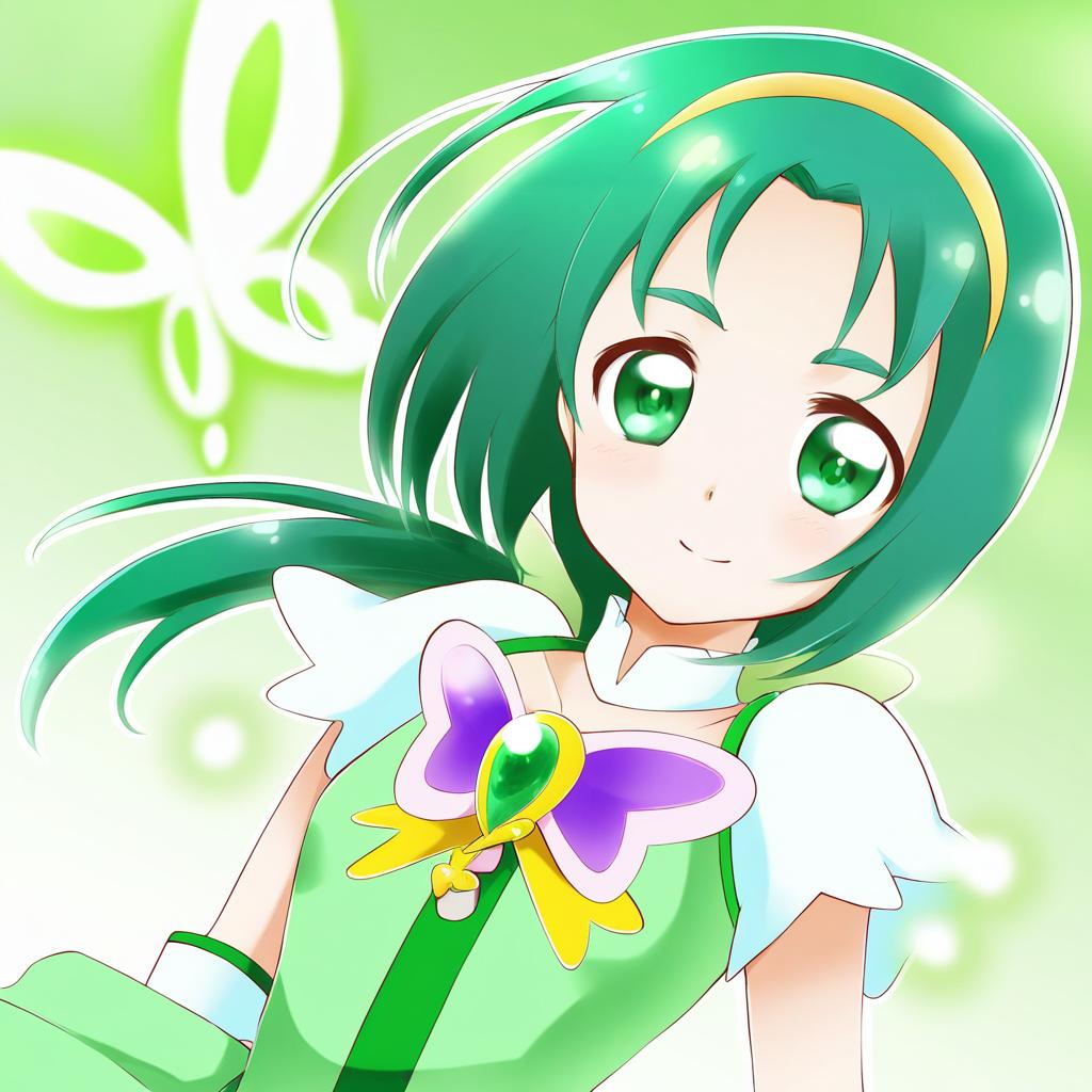 Akimoto komachi, precure, 1girl, green eyes, green hair, long hair, magical girl, magical girl, butterfly brooch, by artist kuune rin, leet