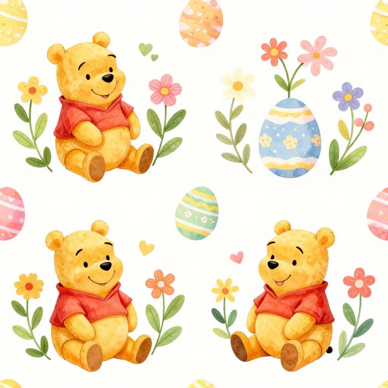 Easter-themed seamless background featuring three playful Winnie the Pooh characters surrounded by colorful flowers, green leaves, and pastel eggs, creating a cheerful and whimsical springtime design.