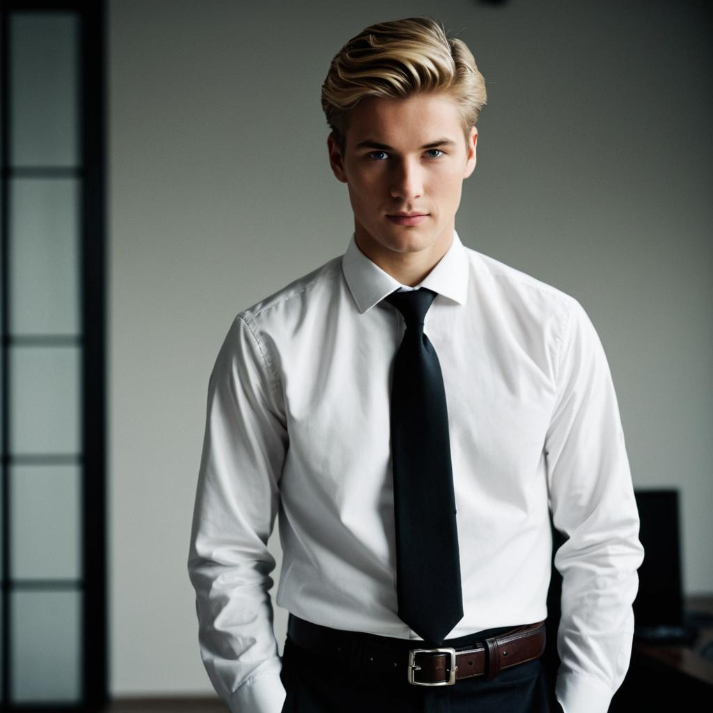 Preppy christmas outfit, photorealistic, young handsome man, standing, Christmas background, Christmas trees with ornaments, red bows, wrapped presents, grey sweater, red suspenders, white shirt, green tie, beige pants, brown belt, wavy brown hair, serious expression, festive setting, realistic lighting, indoor, holiday season, Christmas decorations, high detail, realistic ures