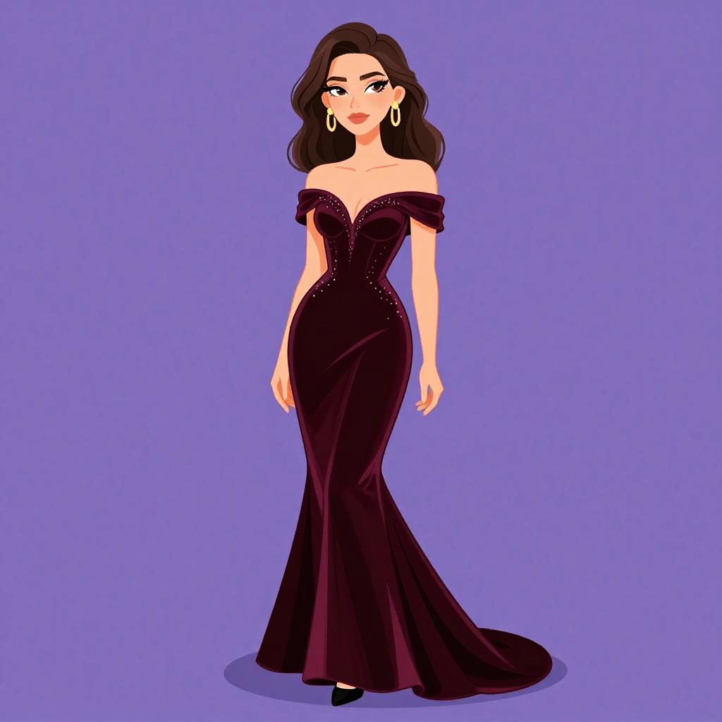 Woman with pretty face and pretty hair. Sophisticated plunging neckline, mermaid silhouette gown, luxurious velvet material, rich burgundy, beaded embellishments, sweetheart bodice, flared hem, off-the-shoulder sleeves, dramatic train, gold statement earrings, classic black pumps. --sref 1461