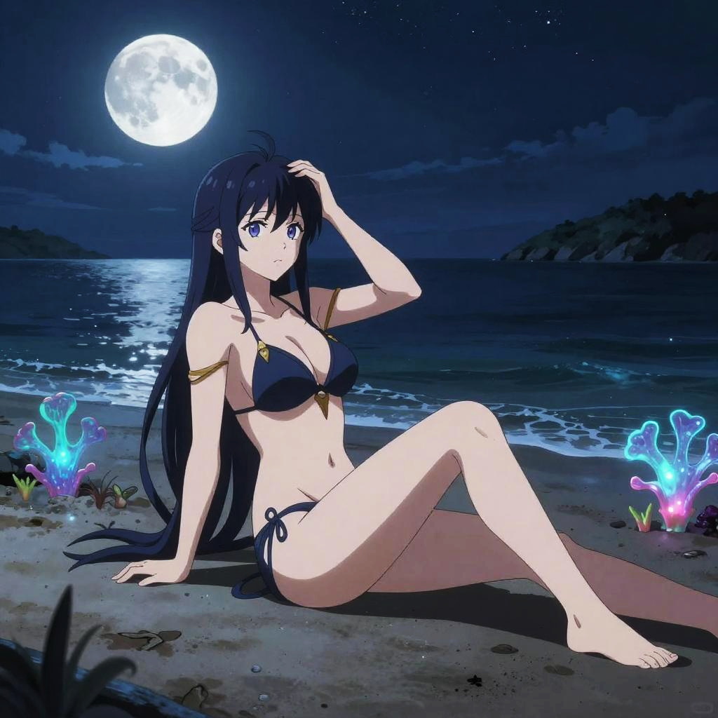 Rimuru bikini fashion illustration, beach setting with soft sand and gentle waves, serene ocean backdrop, character with flowing blue hair, relaxing pose, warm sunlight casting soft shadows, anime aesthetic with emphasis on vibrant colors and sharp details