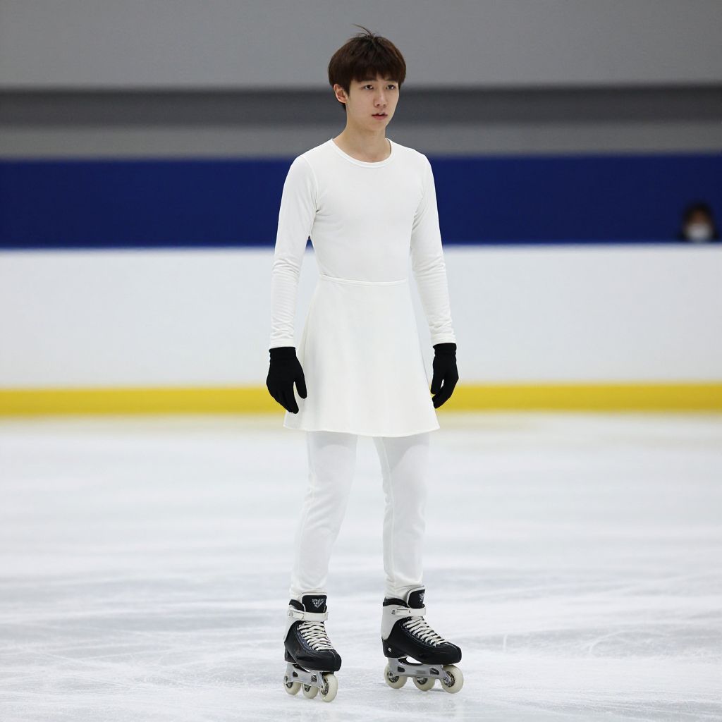 "ice skating outfit male, skates, solo, male focus, 1boy, ice skates, gloves, roller skates, realistic, black gloves, standing, full body, parody, inline skates, dress, looking at viewer, what, white dress, brown hair, long sleeves, asian, cosplay Realistic photo of casual sexy person with pretty face"