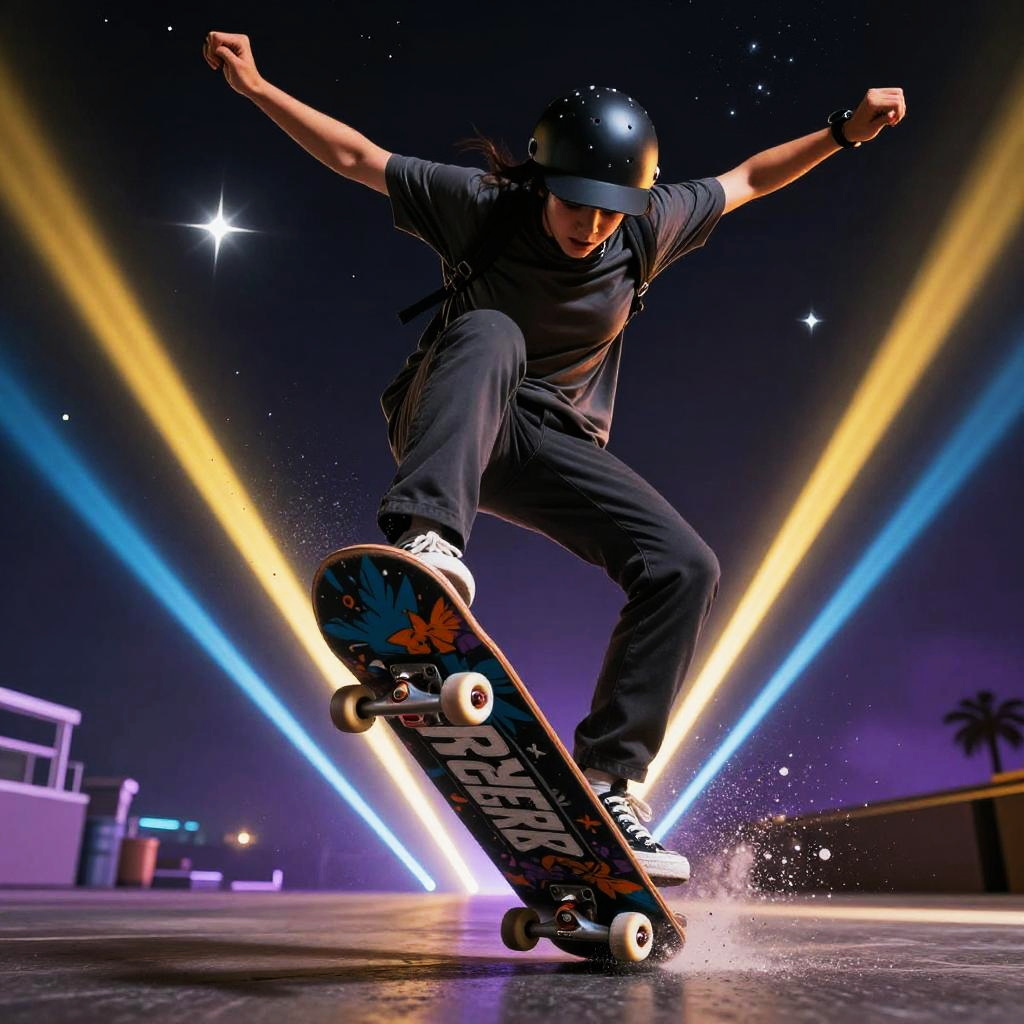 Fantasy skateboard tricks with celestial beams, ethereal, bold and spellbinding action-packed adventure, mysterious and artistic style.