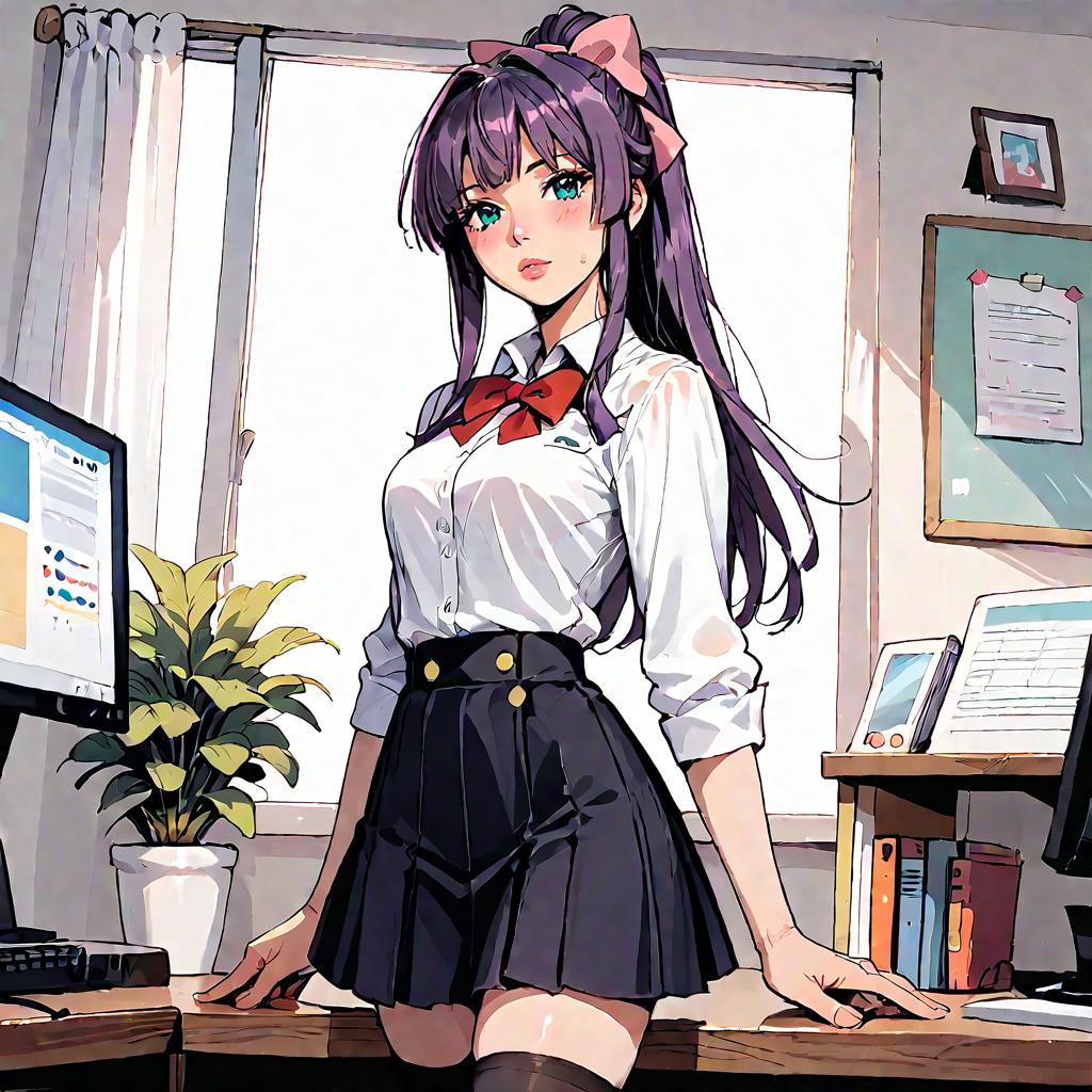 Score_9, score_8_up, score_7_up, source_anime, saehinata, blue eyes, purple hair, dark skin, dark-skinned female, shirt, bow, school uniform, white shirt, collared shirt, bowtie, red bow, sweater vest, brown sweater, skirt, blue skirt, indoors, classroom, looking at viewer, dutch angle, cowboy shot