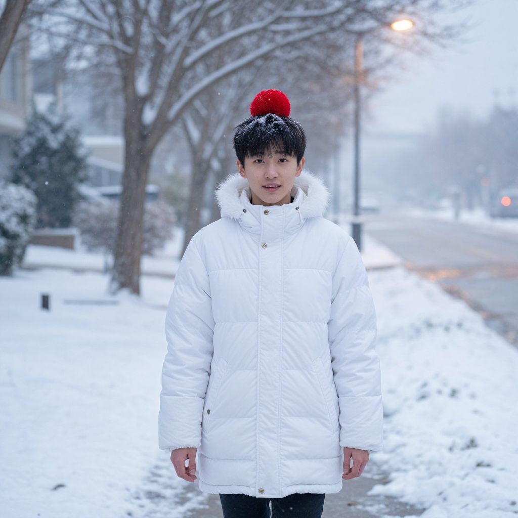 Photograph of an Asian teenage boy in a white puffy winter coat and red pom-pom hat, standing on a snowy street. Snow-covered trees