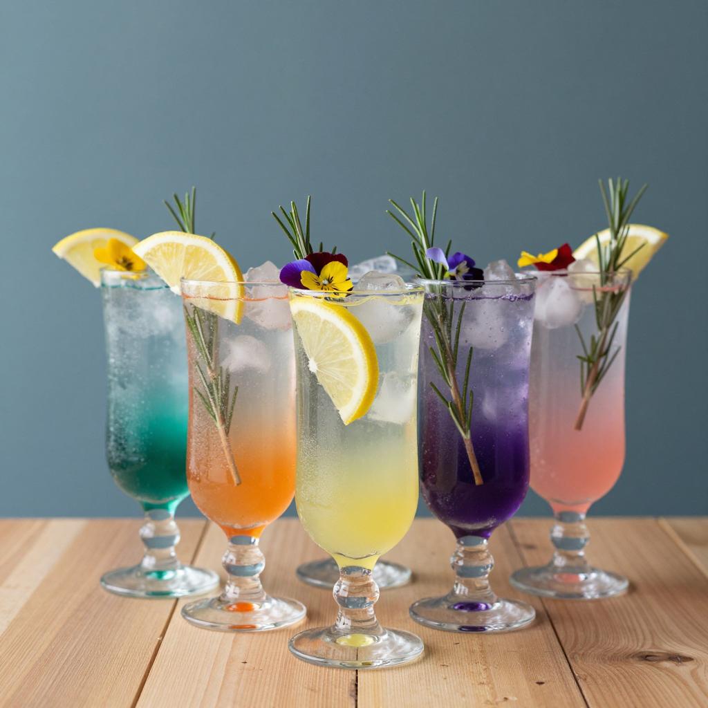 Five tall, glass cocktail glasses with gradient colors (green, blue, orange, purple, pink) on a wooden surface. Each glass has ice, lemon slices, small edible flowers, and sprigs of rosemary. Background is a solid blue-green color. Glasses are lined up side by side.