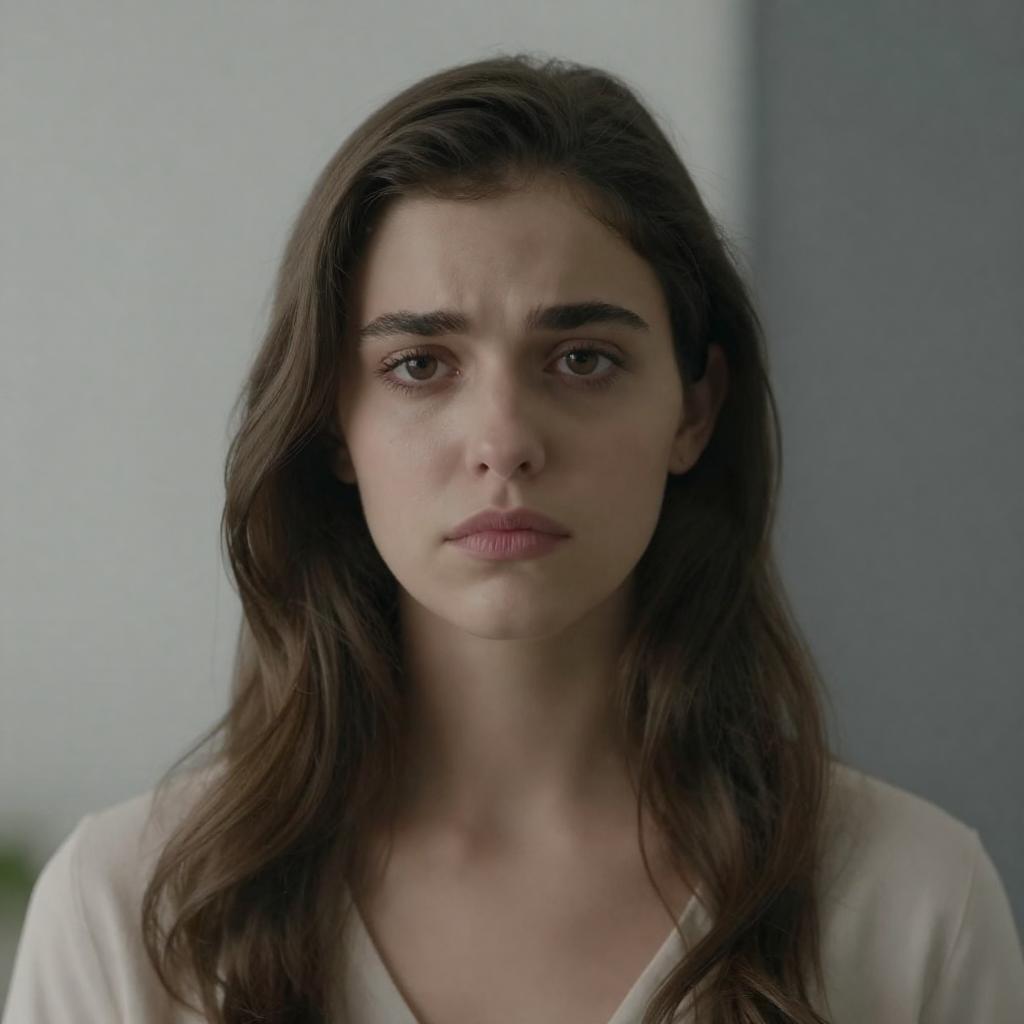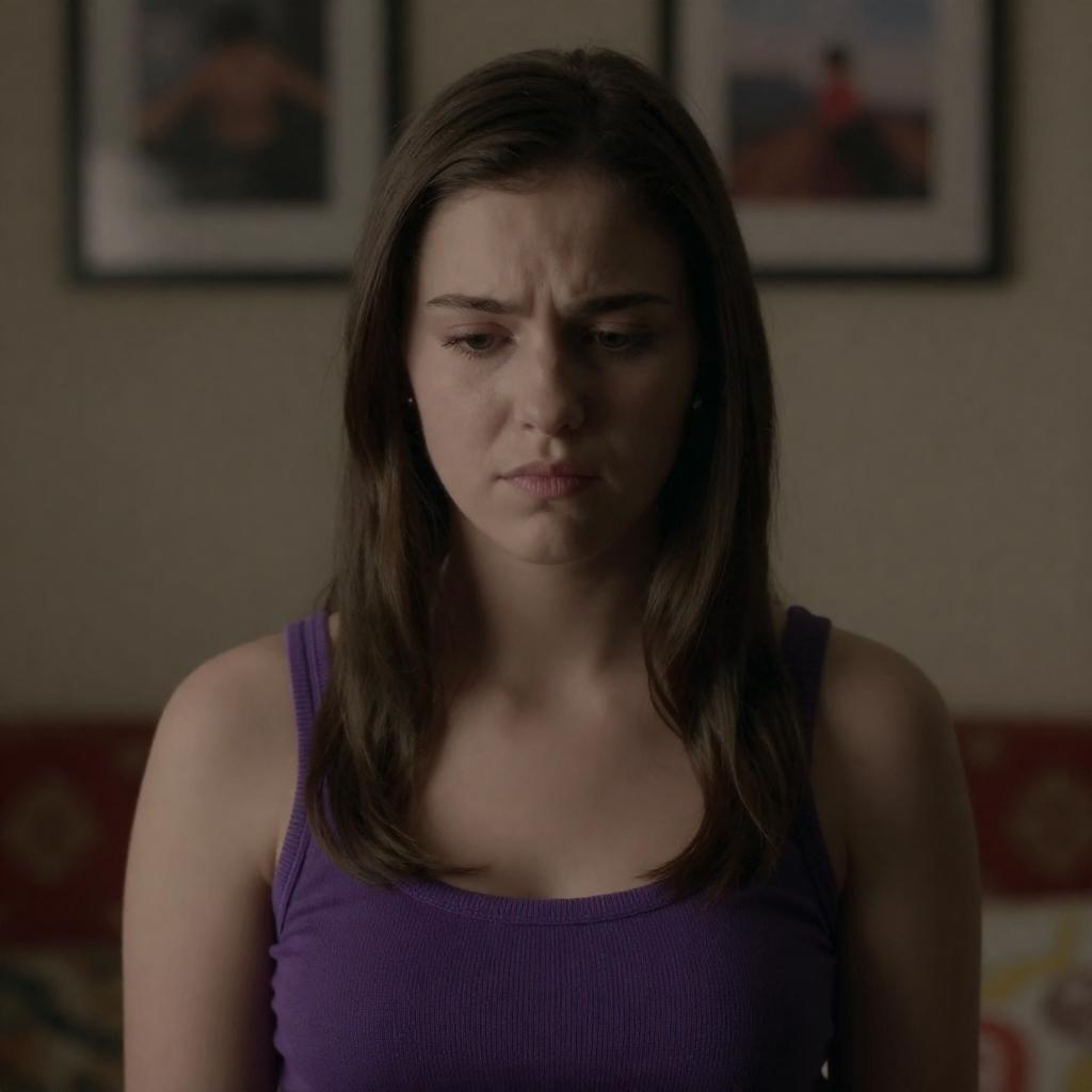 Photograph of a young woman with long brown hair, fair skin, wearing a purple knit tank top. She looks down with a slight frown. Blurred indoor background with framed pictures and a red-patterned couch. Dim lighting. Upper body focused.
