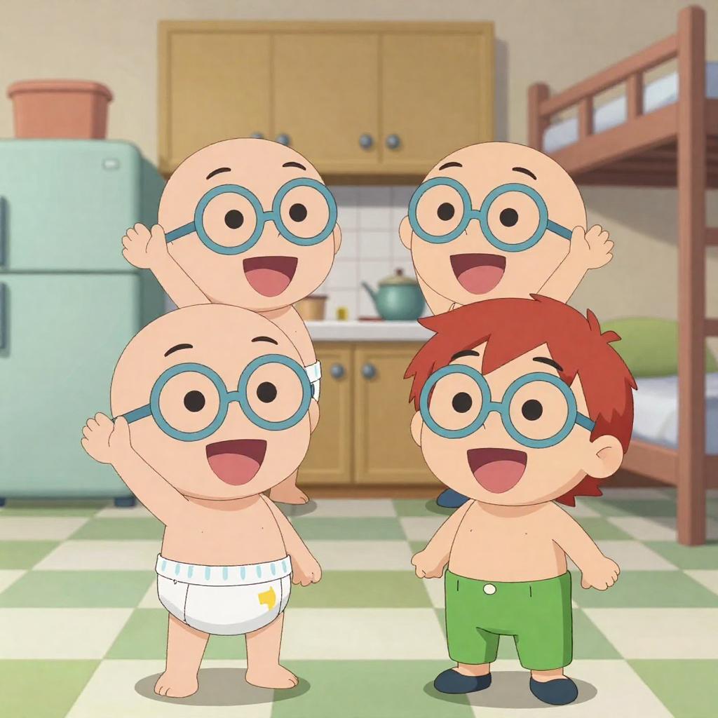 Anime-style drawing of six characters standing in a row. Tall, black-suited man with mustache in center. Five others: small blue-skinned boy in red jacket, white-haired boy in yellow coat, red-haired boy in red outfit, short-haired boy in white uniform, black-haired boy in green jacket. Simple white background. Characters have varied expressions, some neutral, some slightly smiling. Tall man stands behind others, shorter ones in front.