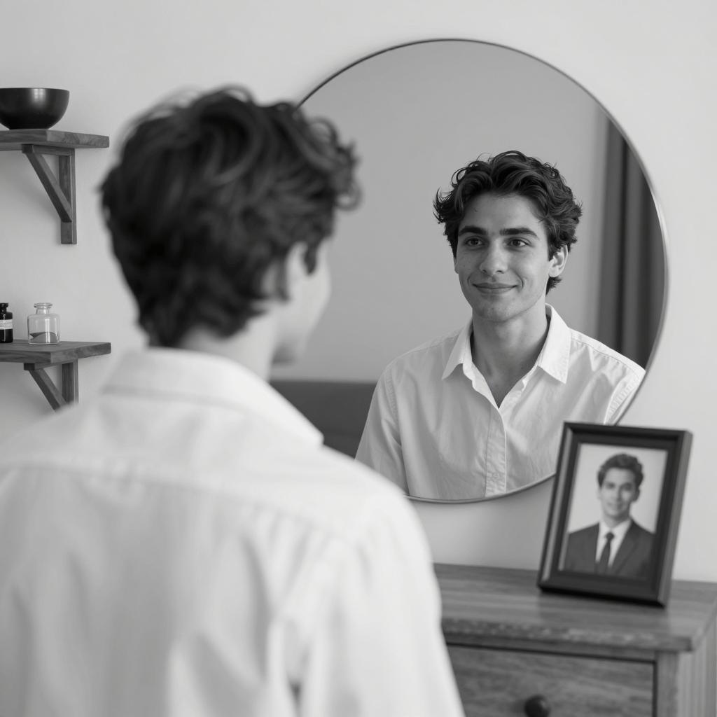A man with curly brown hair shaves in front of a bathroom mirror, his face covered in white shaving cream. A second man with dark hair and a serious expression stands shirtless in the shower in the background. Both wear white t-shirts. The bathroom has beige tiled walls and a silver showerhead. A white towel hangs on the right. The man shaving looks at his reflection while holding a razor in his right hand.