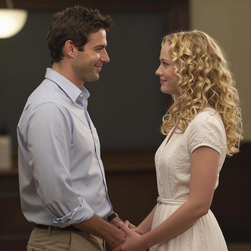 A man and woman standing close, facing each other. The man, with short dark hair, wears a light blue striped shirt, smiling at the woman. The woman, with curly blonde hair, wears a white dress with short sleeves, smiling slightly. They are indoors, with a blurred background of lights and dark shadows. The man holds the woman's hand gently. Both have light skin. The woman has a subtle smile, while the man looks at her with a smile.