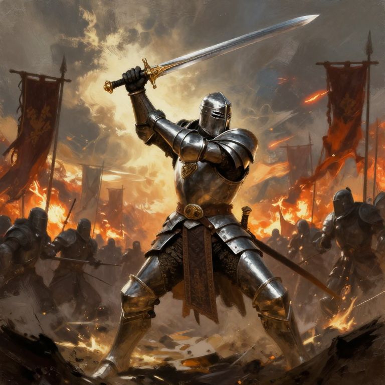 Digital fantasy artwork of a armored knight wielding a sword, standing victorious amidst a chaotic battlefield with blazing fires and flags.