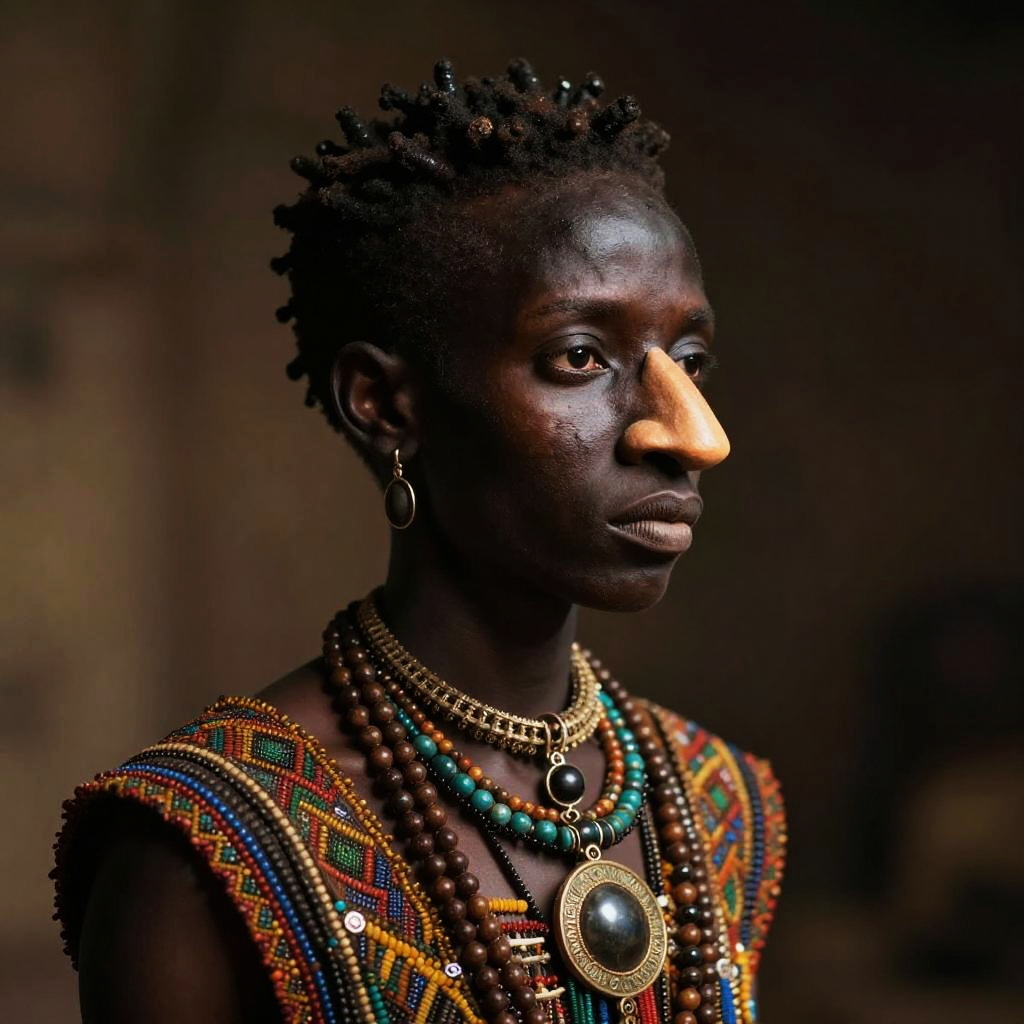 Nariz negroide, fantasy character design inspired by African heritage, dramatic lighting, stylized nose features, rich in detail, vibrant costume elements, cinematic atmosphere
