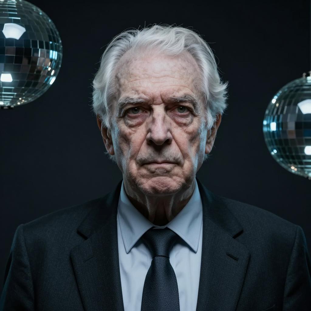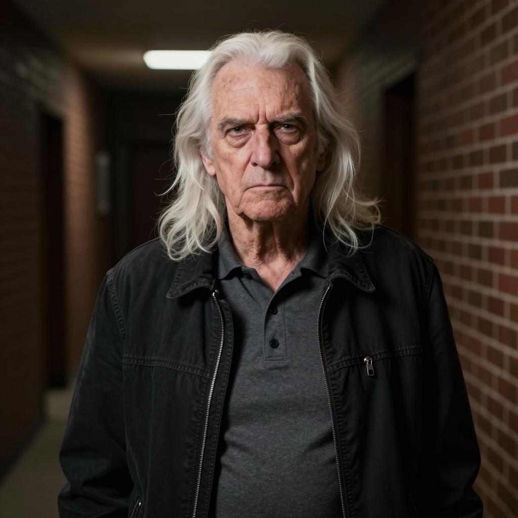 Old man with pale skin and long white hair, wearing dark clothing with a beige scarf, serious expression, dark wooden background.