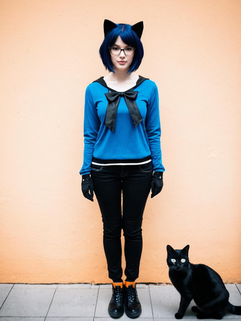 Photo-realistic cosplay photo of person standing in morgana (persona 5) costume. blue eyes, glasses, long hair, short hair, black hair, orange hair, long sleeves, cat, black cat, animalfull body shot. lifestyle stock photo, shallow depth of field, lifestyle stock photography, shallow depth of field, natural lighting, warm tones, soft background blur, vibrant colors, realistic textures
