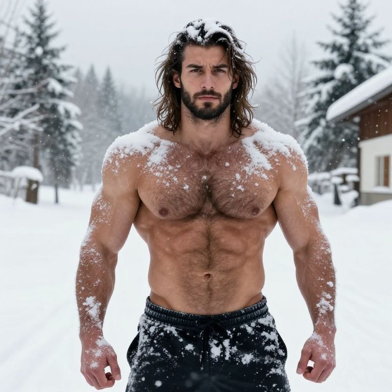 In the image, a muscular individual stands prominently in a snowy landscape, with snowflakes gently descending around him. His body is covered in a thick layer of snow, accentuating his well-defined, gigantic, and hairy pecs. The man's hair is long and tousled, adding to the rugged, outdoor aesthetic. The background features a serene winter scene with snow-covered trees and a building, creating a stark contrast with the muscular figure in the foreground. The overall composition is dynamic, with the man's powerful physique drawing the viewer's eye immediately, while the tranquil winter setting provides a peaceful backdrop.