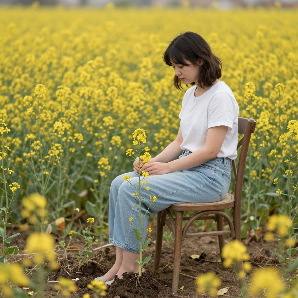 Photograph of a young woman with shoulder-length black hair, wearing a white t-shirt and light blue, high-waisted, ankle-length denim pants, sitting on a wooden chair in a vast field of blooming yellow flowers. She is holding a yellow flower, gazing down at it, with soft natural light highlighting her serene expression. The background is a dense, vibrant yellow field, with the horizon slightly blurred, emphasizing the depth and expansiveness of the flower field. The soil around her is dark and slightly disturbed. The overall mood is peaceful and contemplative.