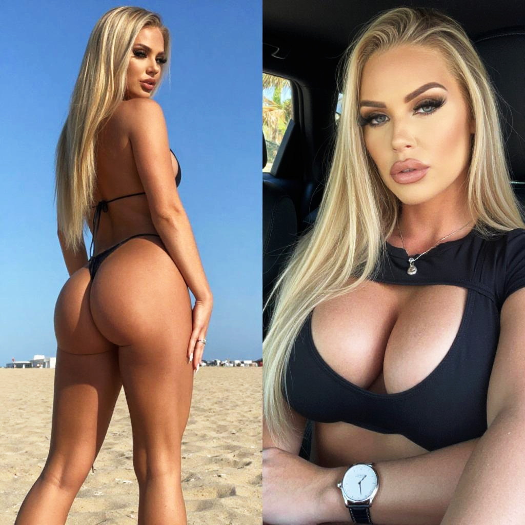 This is a composite photo featuring a close-up selfie of a young woman with long blonde hair, tan skin, and full lips. She's wearing a low-cut beige top that highlights her large breasts, a white watch, and a bracelet. She's sitting in a car with a sandy beach and blue sky in the background. Her confident expression and slight smile are prominent.