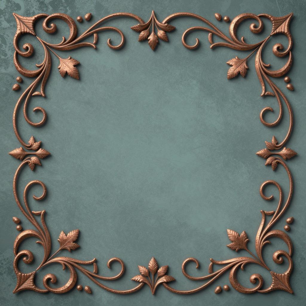 Scrollworks pattern featuring Art Nouveau flowing organic tendrils with stylized leaves in oxidized copper scrollwork on weathered teal arranged as corner flourishes framing an empty central space on ornate invitation or certificate background rendered as highly detailed digital illustration with subtle embossing and soft shadows, ultra-detailed, sharp ornamental design, high resolution, intricate decorative pattern art