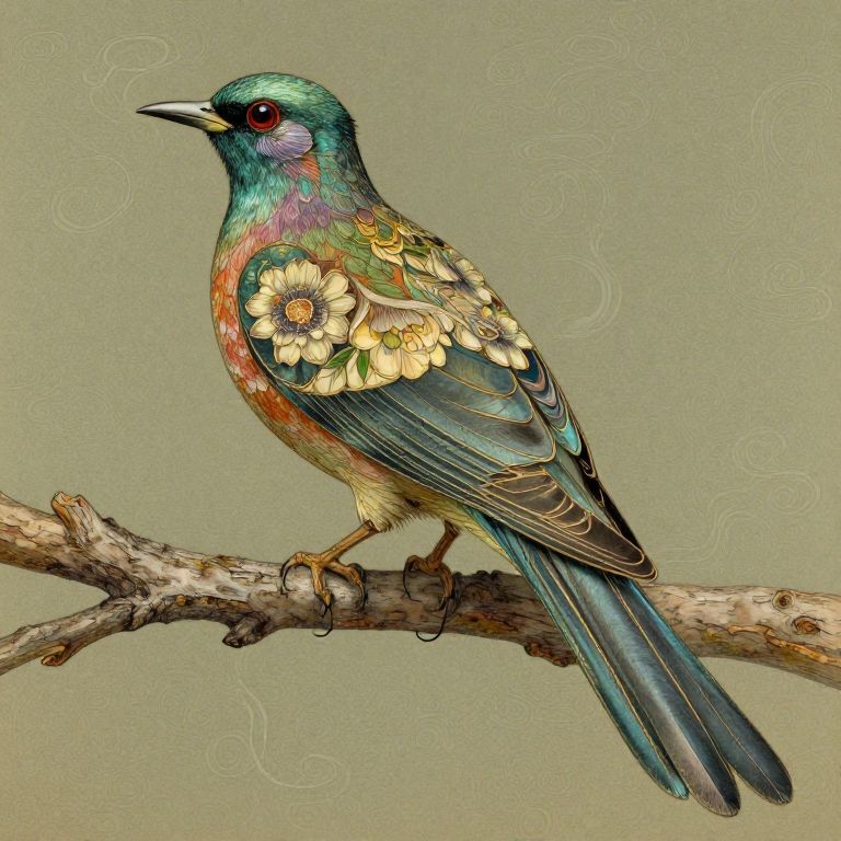 Opium bird art illustrating a mystical bird perched on an ancient branch, with its plumage comprised of opium flower motifs and delicate vapor trails, rendered in rich jewel tones with a touch of art nouveau style.