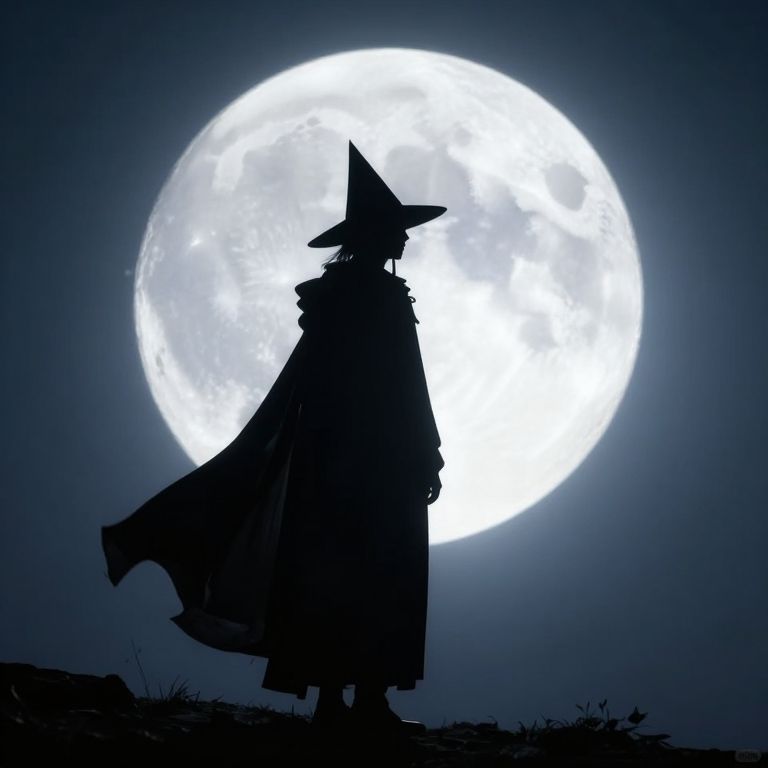 A solitary figure cloaked in shadow stands silhouetted against a luminous, oversized moon, their pointed hat and flowing cape evoking a timeless, otherworldly journey through a mystical, moonlit landscape.