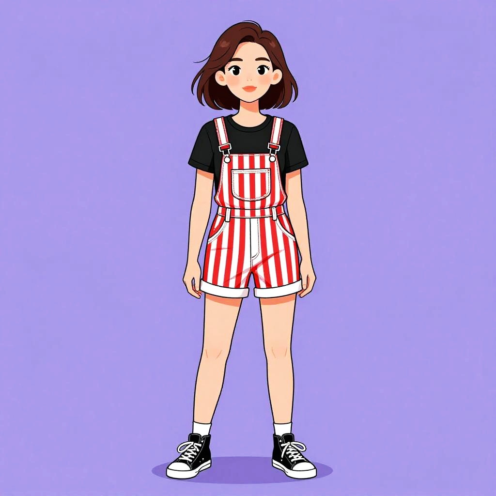 Woman with pretty face and pretty hair. Woman, casual contemporary, short overalls with red and white vertical stripes forming a chevron pattern, fitted design, above-the-knee length, paired with a basic black T-shirt, short sleeves, round neckline, classic black sneakers with white soles, simple white ankle socks, neutral photography studio background. --sref 1467