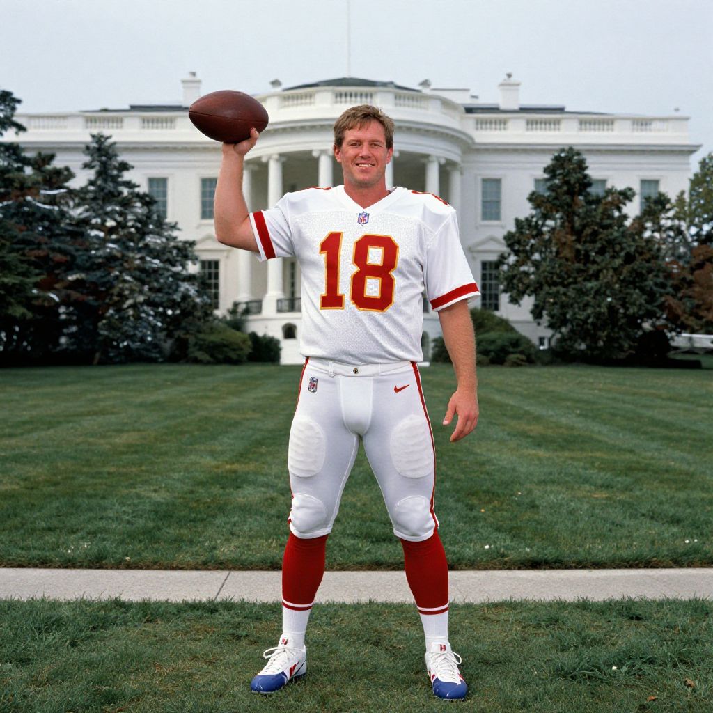 Bionic 20 year NFL quarterback. full body. standing confidently and smiling in front of a full view of the US Whitehouse. norman rockwell colors and style,