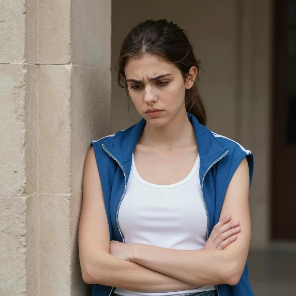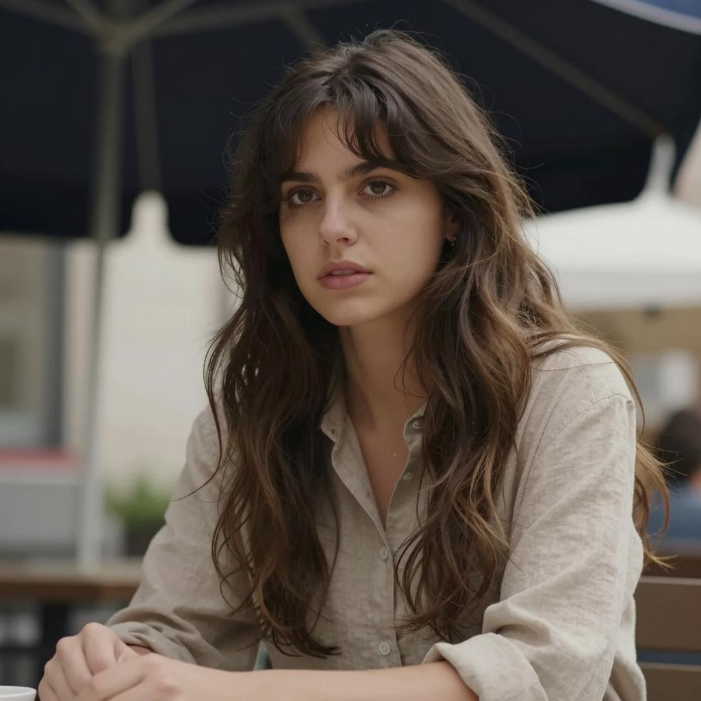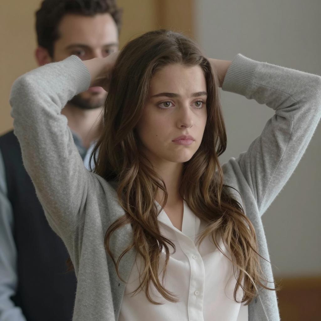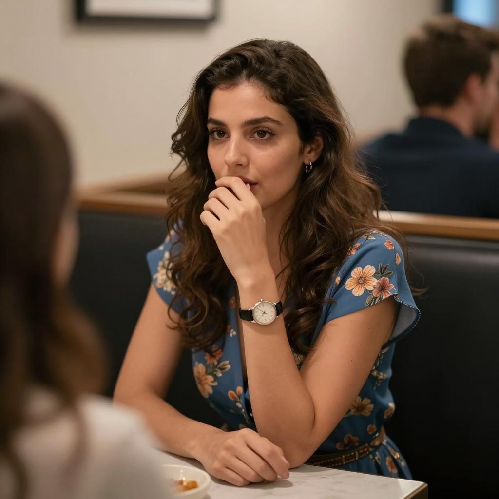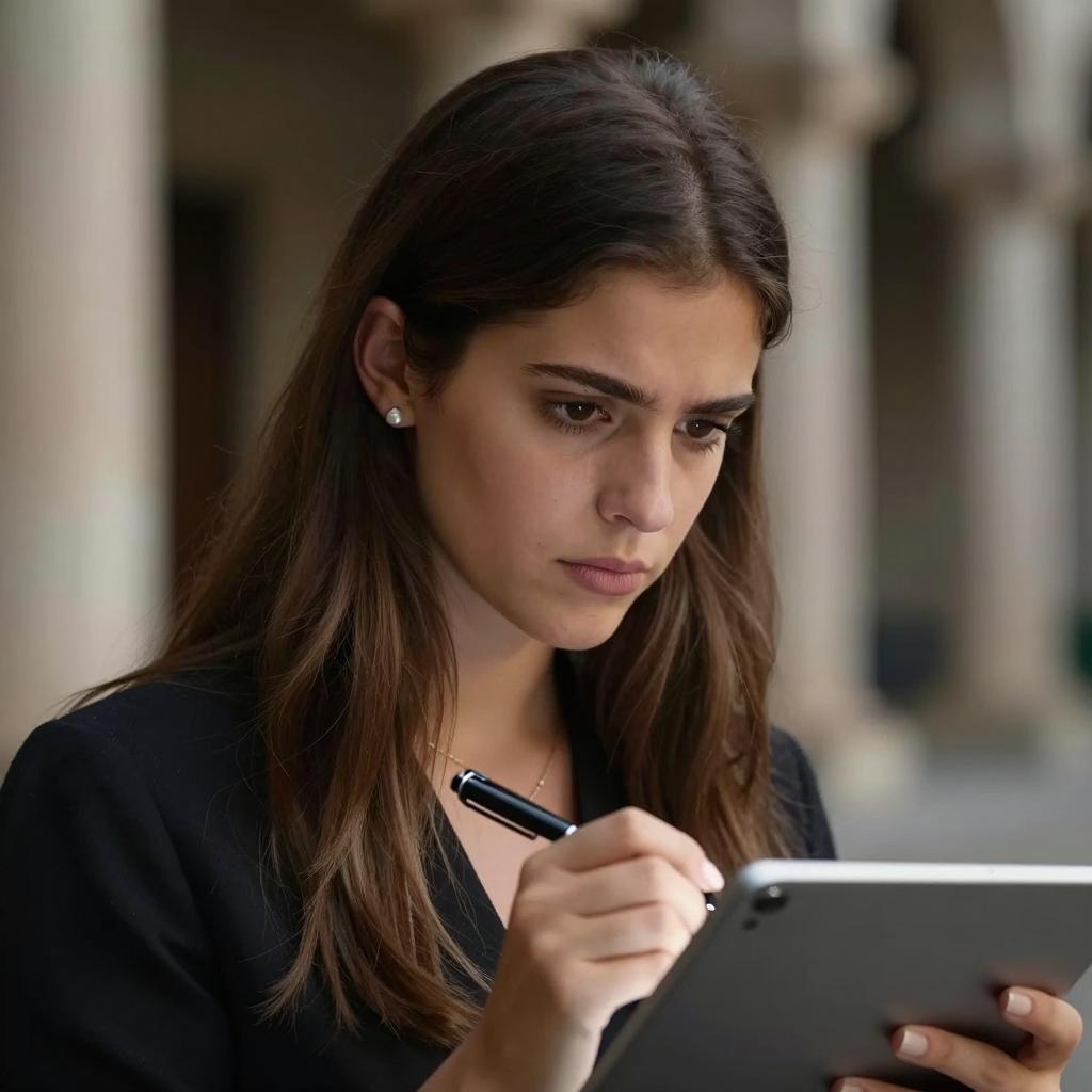 Woman with long brown hair, intense expression, holding a pen in her right hand, writing on a tablet. Dark background with blurred columns. Wearing dark clothing, small pearl earrings. Close-up shot, upper body.