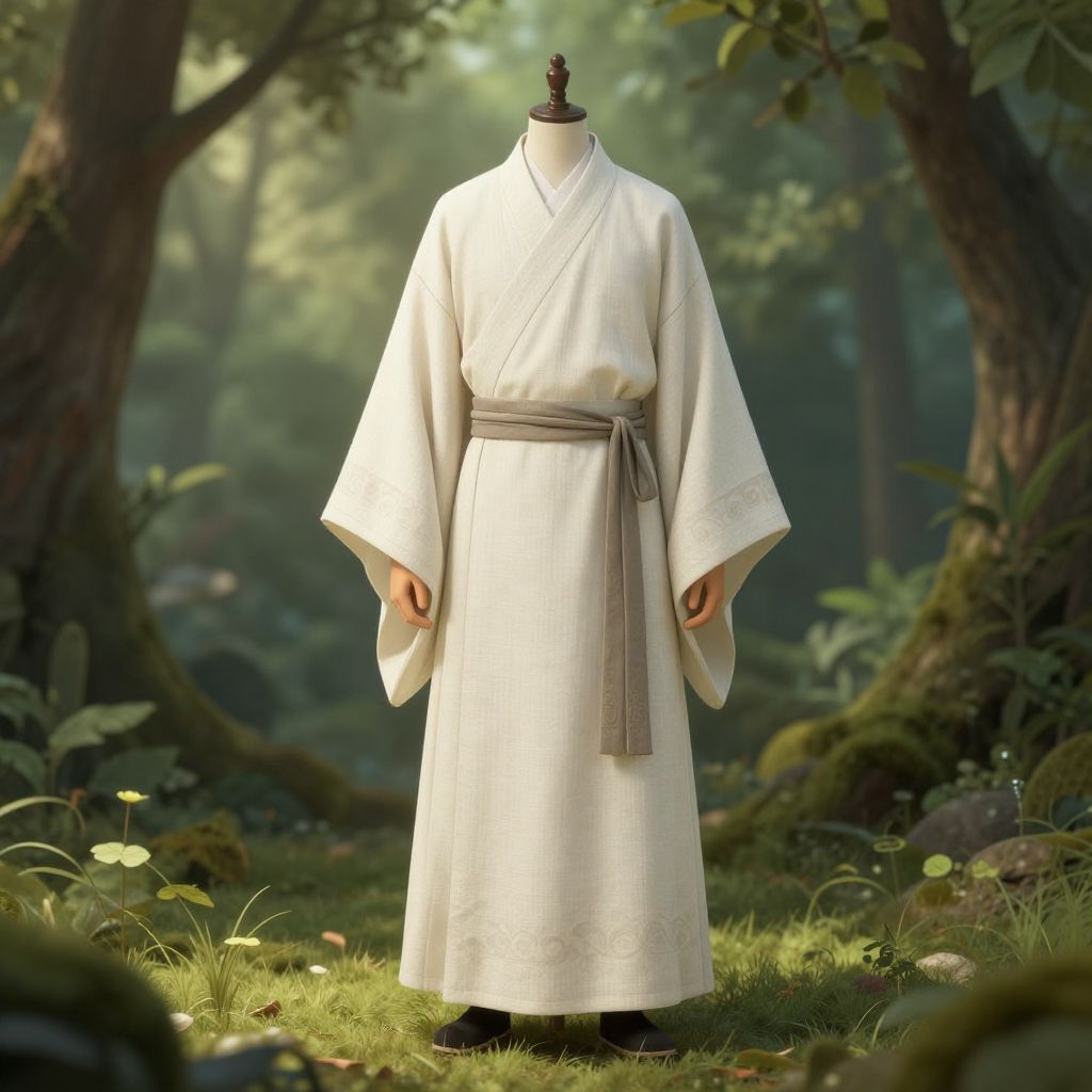 Monk robes DnD character design, minimalist but elegant linen robes with sash, subtle patterns inspired by Eastern cultures, set in a lush forest clearing with soft sunlight filtering through leaves, highly detailed fantasy illustration.