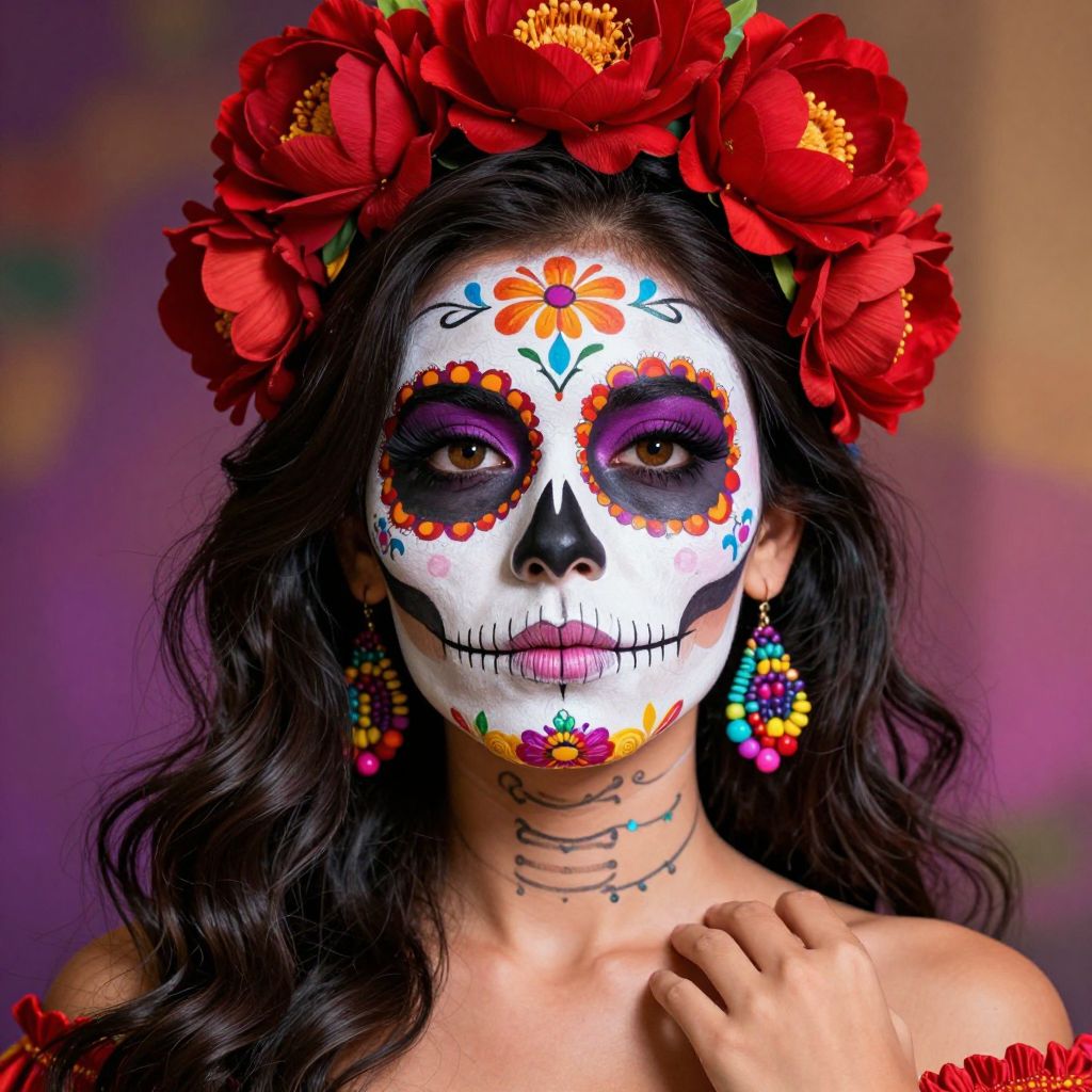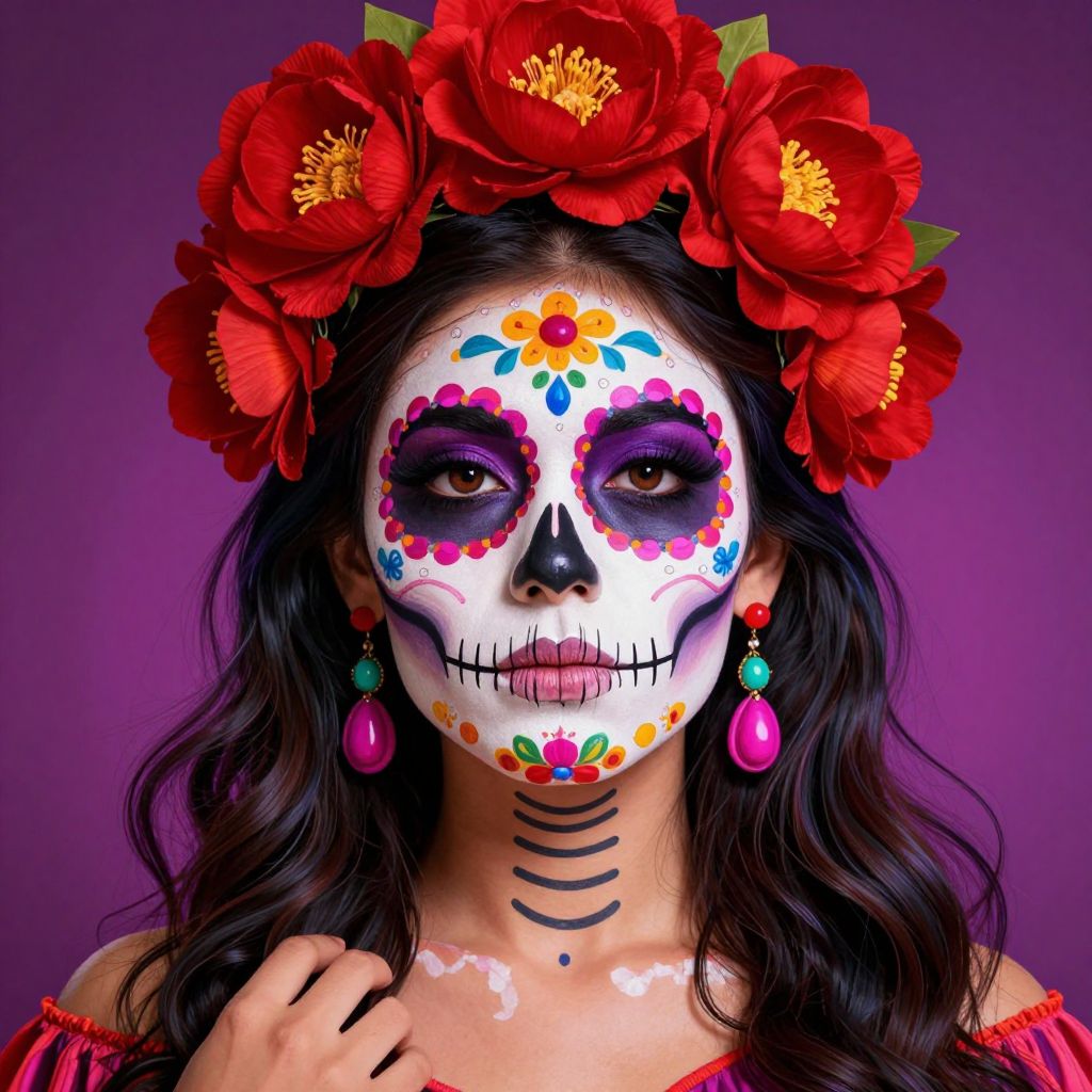 Photograph of a young woman with long, wavy black hair, wearing a vibrant Day of the Dead (Día de los Muertos) face mask adorned with colorful floral patterns in orange, red, and blue. Her eyes are accentuated with purple eyeshadow, and her nose is painted black. She has a crown of large, red flowers on her head and matching red floral earrings. Her skin is fair, and she has a delicate, slender neck with a small black line tattoo. She is wearing an off-shoulder red top. The background is a blurred mix of purple and orange hues, highlighting her festive and traditional Mexican appearance.