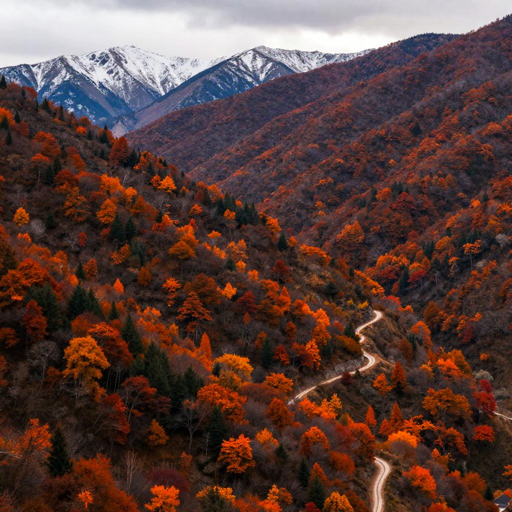 Vast mountain range during autumn, peak colors of fiery orange, red, and gold foliage covering foothills, snowy caps on distant summits, winding paths through dense forests, dynamic composition with dramatic lighting and vivid natural hues.