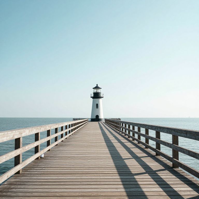 A serene wooden pier stretches toward a lighthouse under a clear sky, inviting contemplation and symbolizing the journey from the familiar shore to the horizon's promise of freedom and discovery.