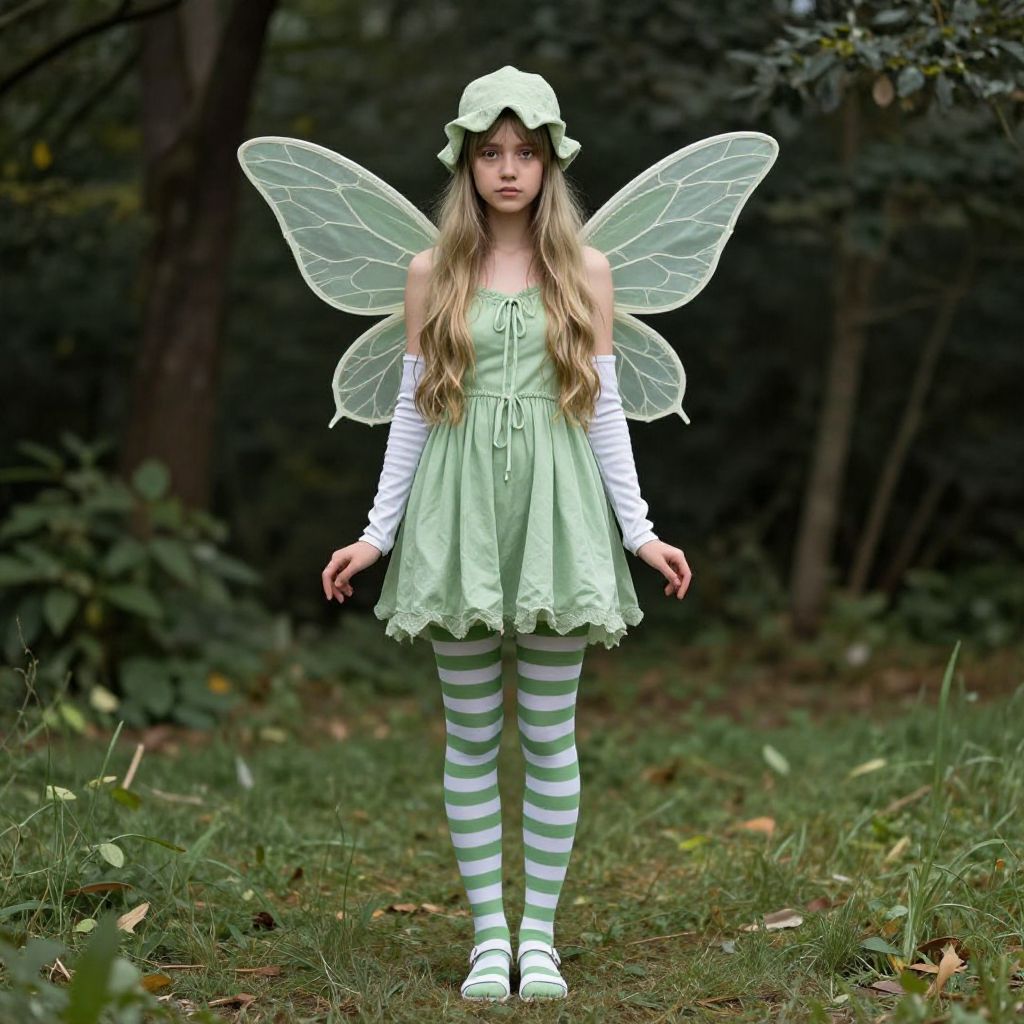 Homemade tinkerbell costume, 1girl, wings, solo, green dress, dress, fairy, flower, blonde hair, fairy wings, hair bun, strapless, outdoors, yellow flower, single hair bun, strapless dress, full body, bare shoulders, realistic, looking at viewer, day