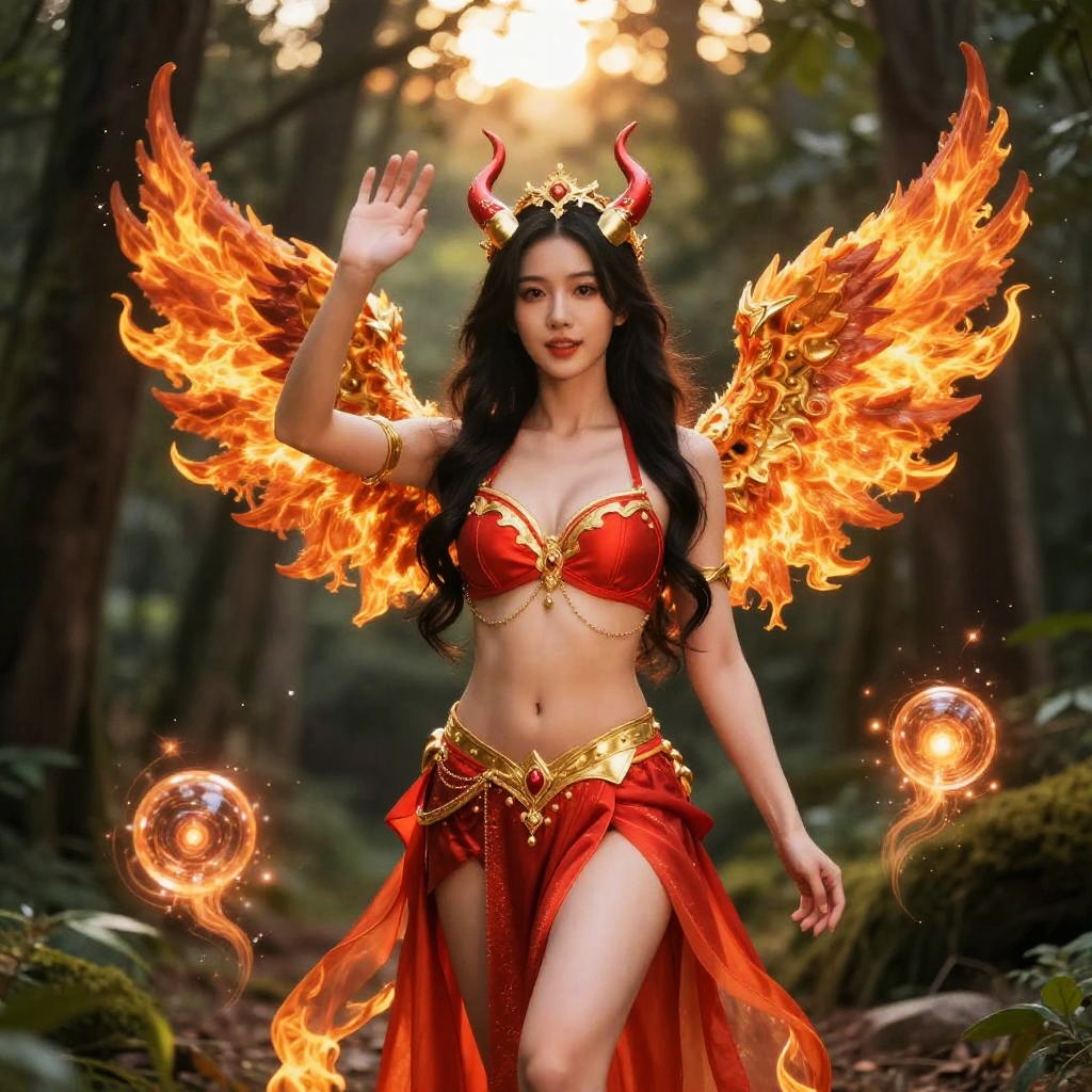 Photograph of a fierce-looking woman with dark hair and pointed elf-like ears, standing amidst bright, orange flames. She's topless, with the flames dancing around her body, highlighting her strong, defined features and intense gaze. The background is dark, making the fire glow even brighter. The image has a dramatic, almost mythical vibe.