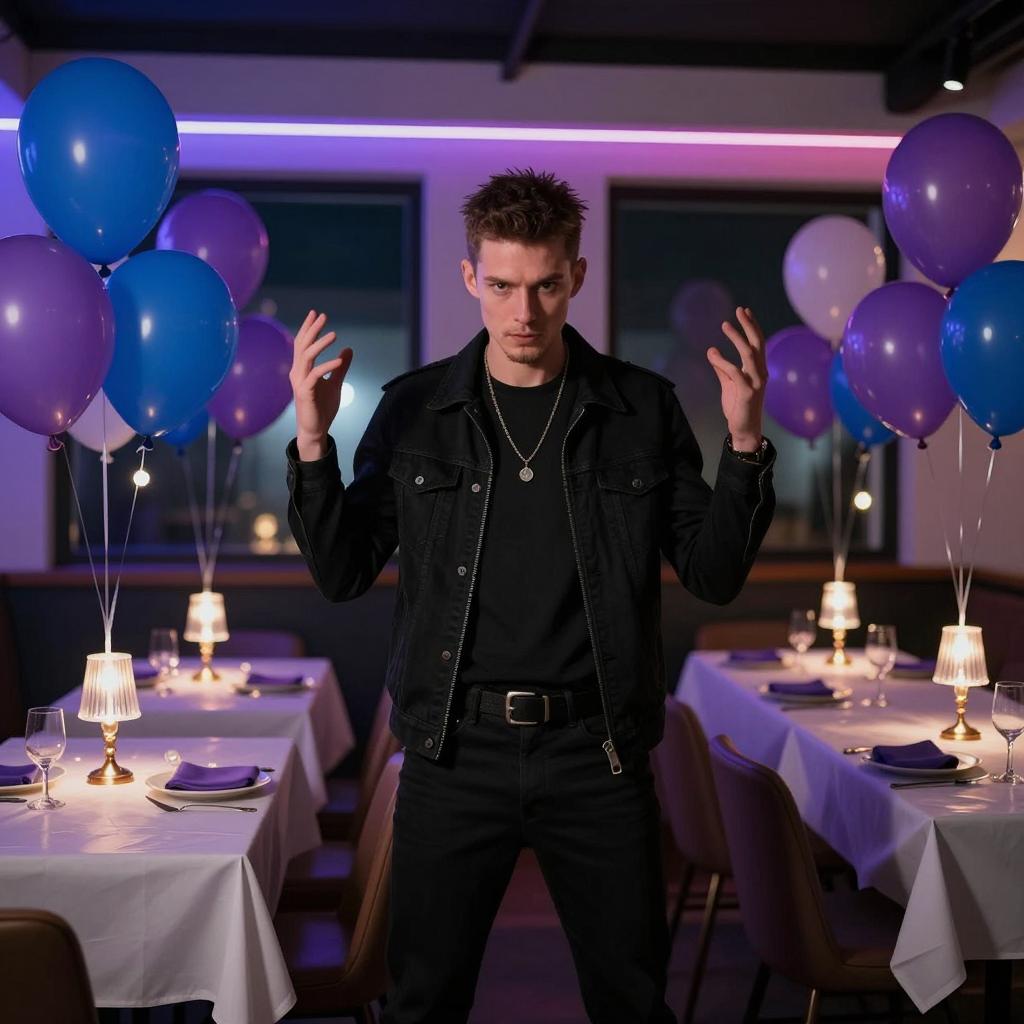 Man in black outfit stands in dimly lit room with purple and blue balloons, tablecloths, and string lights. Background has neon-lit windows. Balloons on left and right, chairs at tables. Man faces camera, arms slightly raised. Intense expression. Two tables with clear glass lamps.