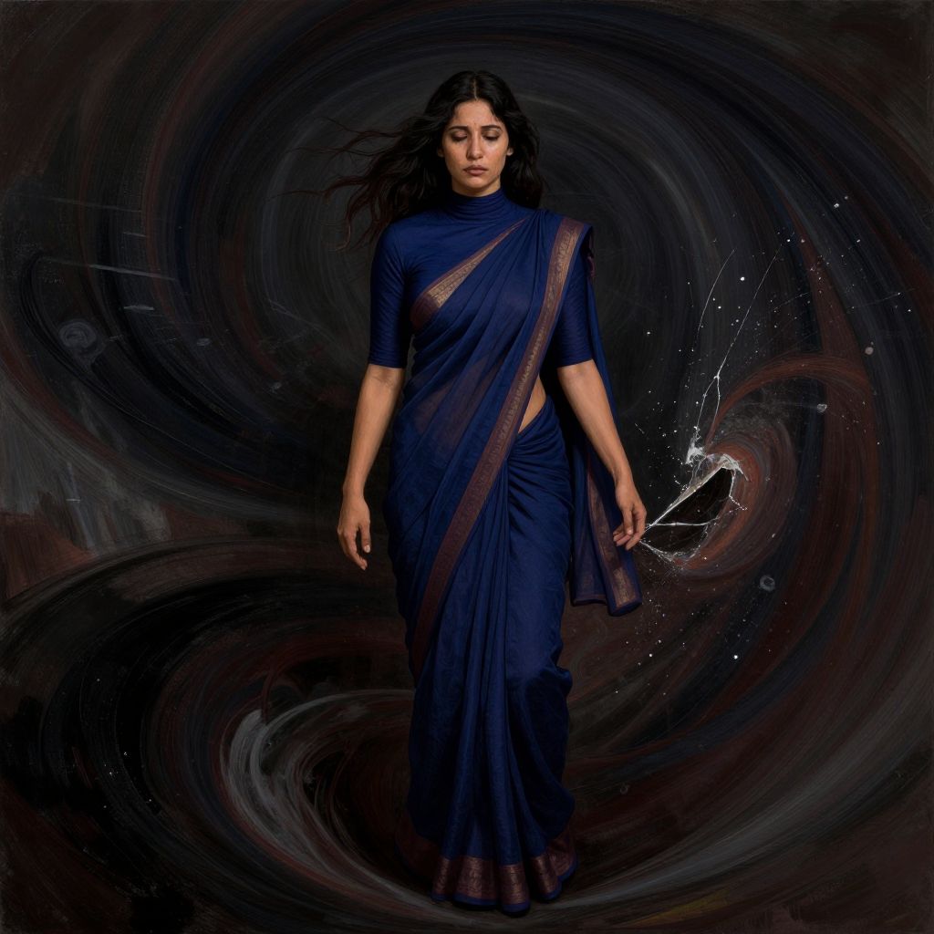 Hyperrealistic art concept art wearing (saree), 1 woman, flat color, turtle neck, dynamic pose (digital illustration, Drew Struzan, Jackson Pollock), the concept of letting go, freedom, liberation, high contrast, deep, sad, meaningful, paint, abstract, tearing free, guilt, intimate composition, roiling, vortices, melding, digital artwork, illustrative, painterly, matte painting, highly detailed, photographic, realism pushed to extreme, fine texture, incredibly lifelike