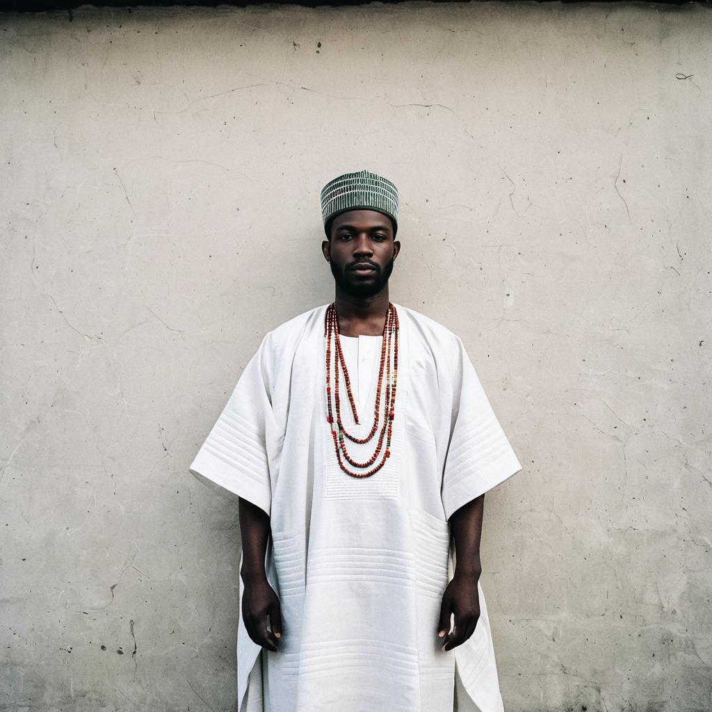 White Agbada Style, man in traditional clothing standing in front of a wall