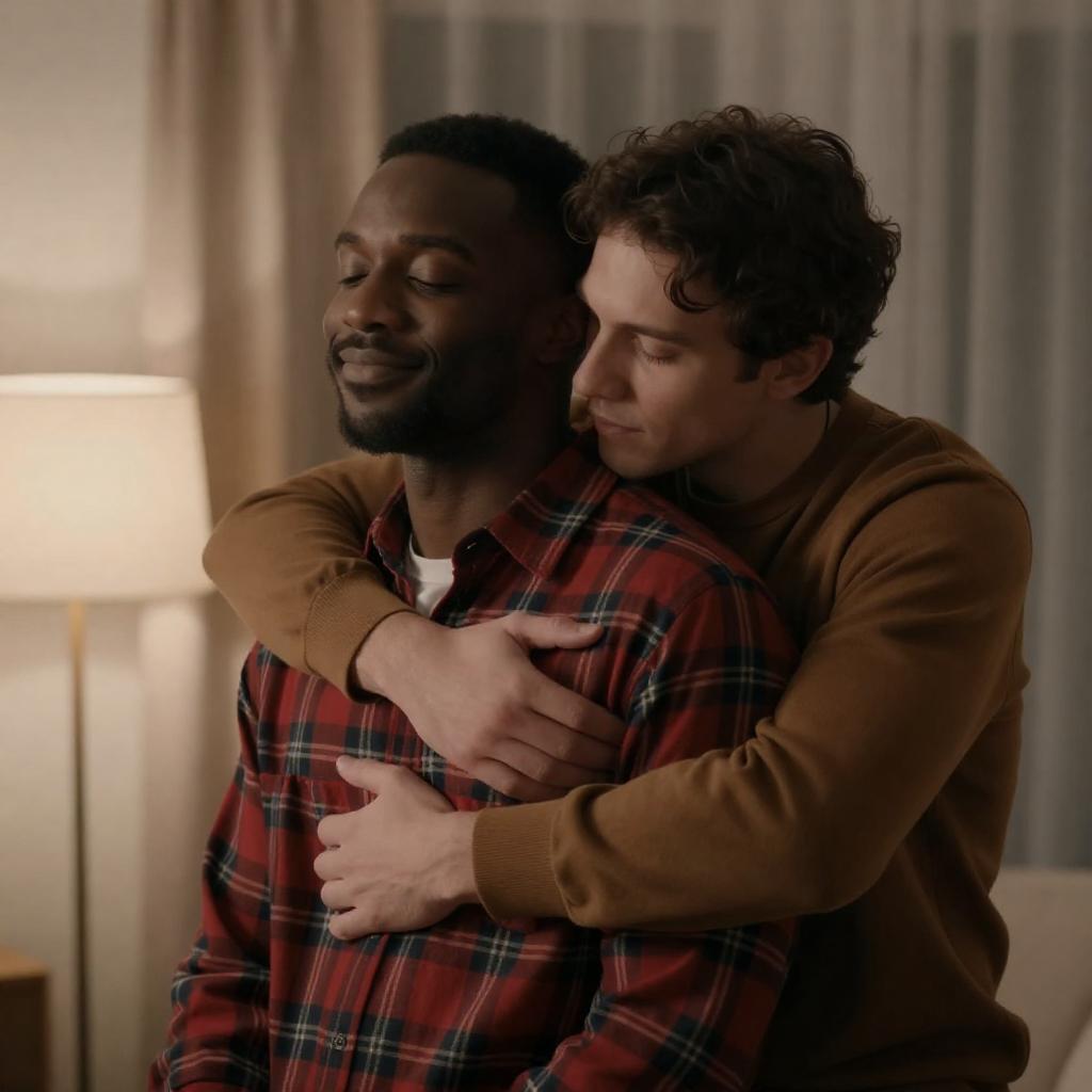 Photograph of two shirtless men in bed. Dark-skinned man with short hair and intense gaze leans over lighter-skinned man with closed eyes and relaxed expression. Dark leather headboard, golden floral pillows, and warm orange lamp in background.