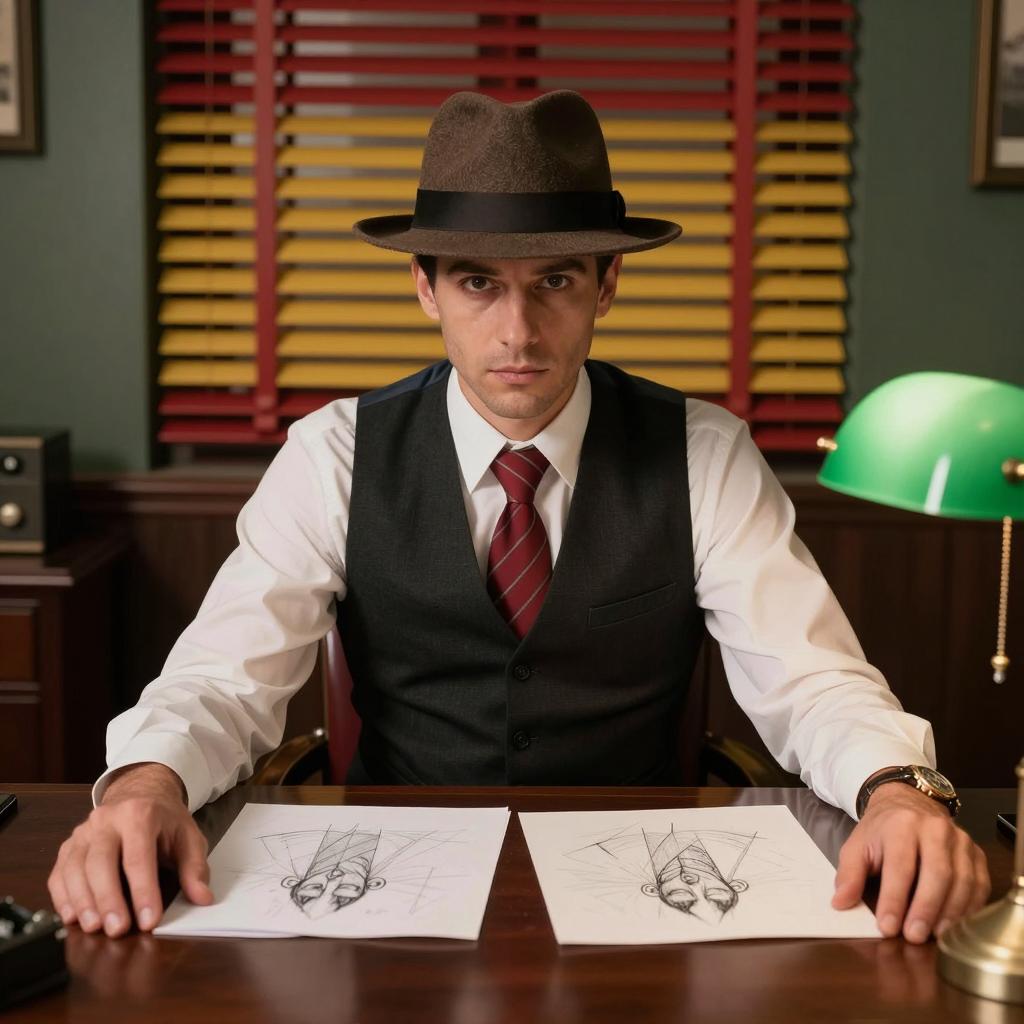 Man in white shirt, red-striped tie, black vest, and brown fedora sits at a desk. Hands spread on desk, looking directly ahead. Desk has two sketches, one on each side. Background has red and yellow blinds. Green lamp on right. Dark room.