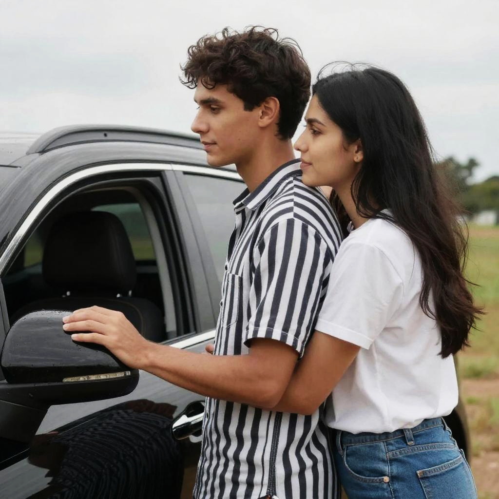 Photograph of a couple embracing beside a black car. The man, with short dark hair, wears a black and white striped shirt, and the woman, with long black hair, wears a white t-shirt and blue jeans. She's hugging him from behind, her hand resting on the car window. The background is slightly out of focus, showing a grassy area and a cloudy sky.