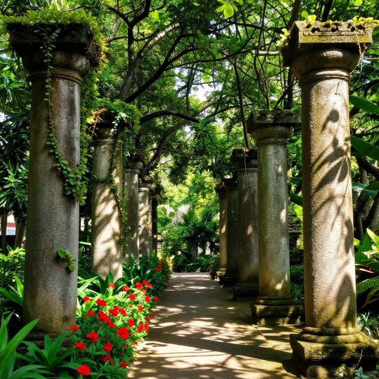 Ancient stone columns stand majestically amidst lush greenery, their weathered surfaces entwined with vibrant vines and illuminated by dappled sunlight filtering through a canopy above, creating a serene pathway lined with fiery red flowers and verdant foliage.