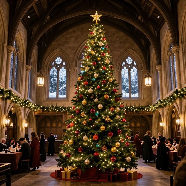 The image depicts a festive scene set in a grand, Gothic-style hall, reminiscent of Hogwarts from the Harry Potter series. The central focus is a large, intricately decorated Christmas tree adorned with colorful baubles and a star-topped tree topper, standing majestically in the middle of the room. The tree is surrounded by a warm glow from the hanging lanterns and the soft light filtering through the arched windows, which reveal a snowy landscape outside. The hall is decorated with green garlands and is filled with people dressed in robes, engaged in various activities around tables. The high, arched ceilings and wooden beams add to the grandeur of the setting, creating a sense of depth and scale. The overall atmosphere is one of warmth, celebration, and the magic of the holiday season.