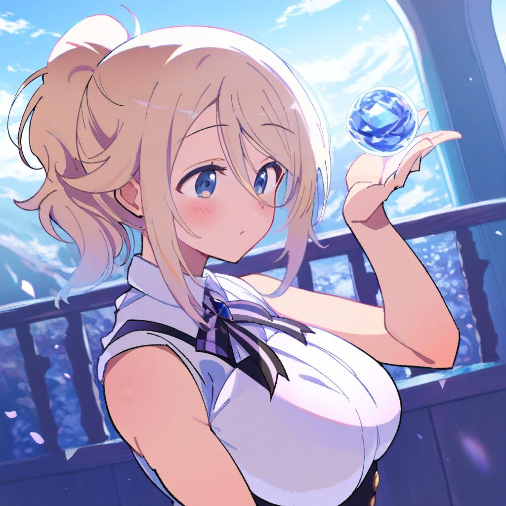 Anime-style illustration of a blonde girl with blue eyes holding a glowing blue orb. She has her hair in a ponytail and wears a sleeveless white top with a black and purple bow. The background features a window with a blue sky and scenic outdoor view.
