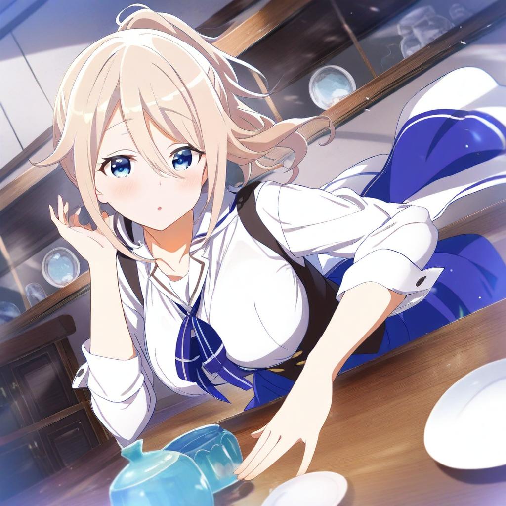Aoyama blue mountain, gochuumon wa usagi desu ka?, 1girl, blue eyes, hair between eyes, blonde hair, long hair, short hair, ponytail, large breasts, medium breasts, by artist inudori, animagine