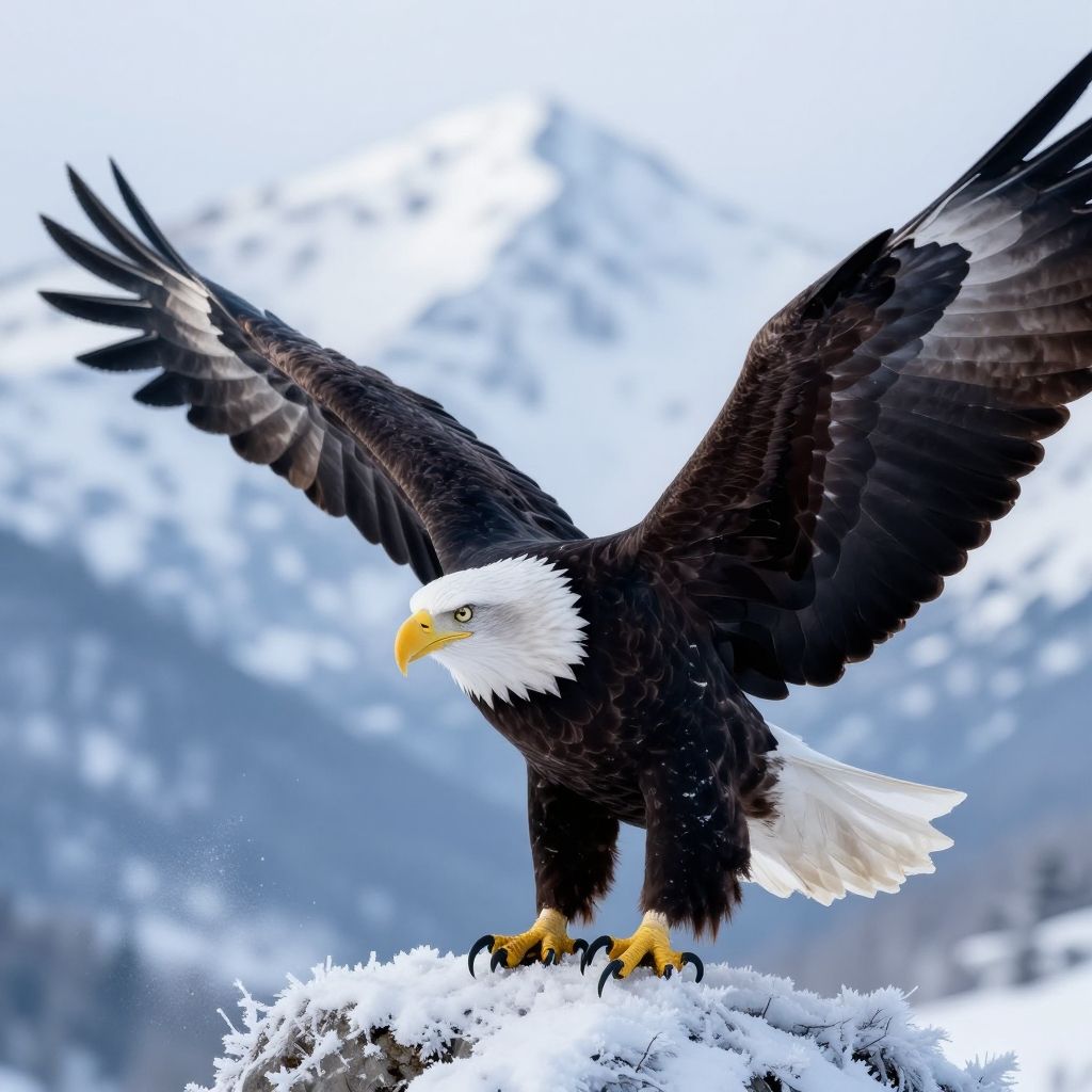 Photograph of a majestic bald eagle with outstretched wings, yellow beak, and sharp talons standing on a snowy rock. Background: blurred