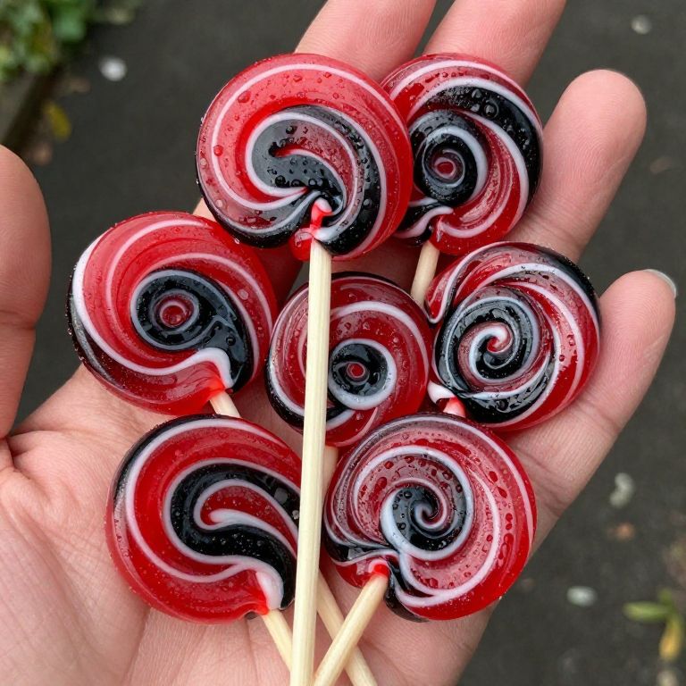 Photograph of a hand holding seven vibrant, red and black swirled lollipops with a wooden stick in the center. The lollipops have a glossy, sugar-coated texture and are arranged in a circular pattern. The hand is slightly tanned with visible skin texture. The background is blurred, dark, and outdoors with hints of green foliage. The lollipops' red and black swirls create a striking contrast, and the wooden sticks are light beige. The overall image is bright and colorful, focusing on the lollipops' intricate swirls and the hand's hold.