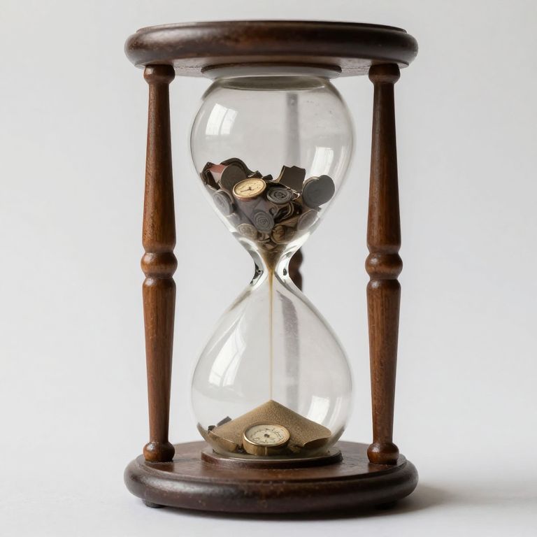 Photograph of a classic hourglass with a dark wooden frame and four cylindrical supports. The hourglass contains clear glass bulbs; the upper bulb has a collection of metallic gears and small coins, while the lower bulb holds a single, larger metallic gear at the bottom. The wooden frame is polished with a rich, dark brown finish, and the glass is transparent, allowing the intricate details of the gears and coins to be visible. The background is plain white, highlighting the hourglass's craftsmanship. The image has a sharp focus, emphasizing the textures and materials.